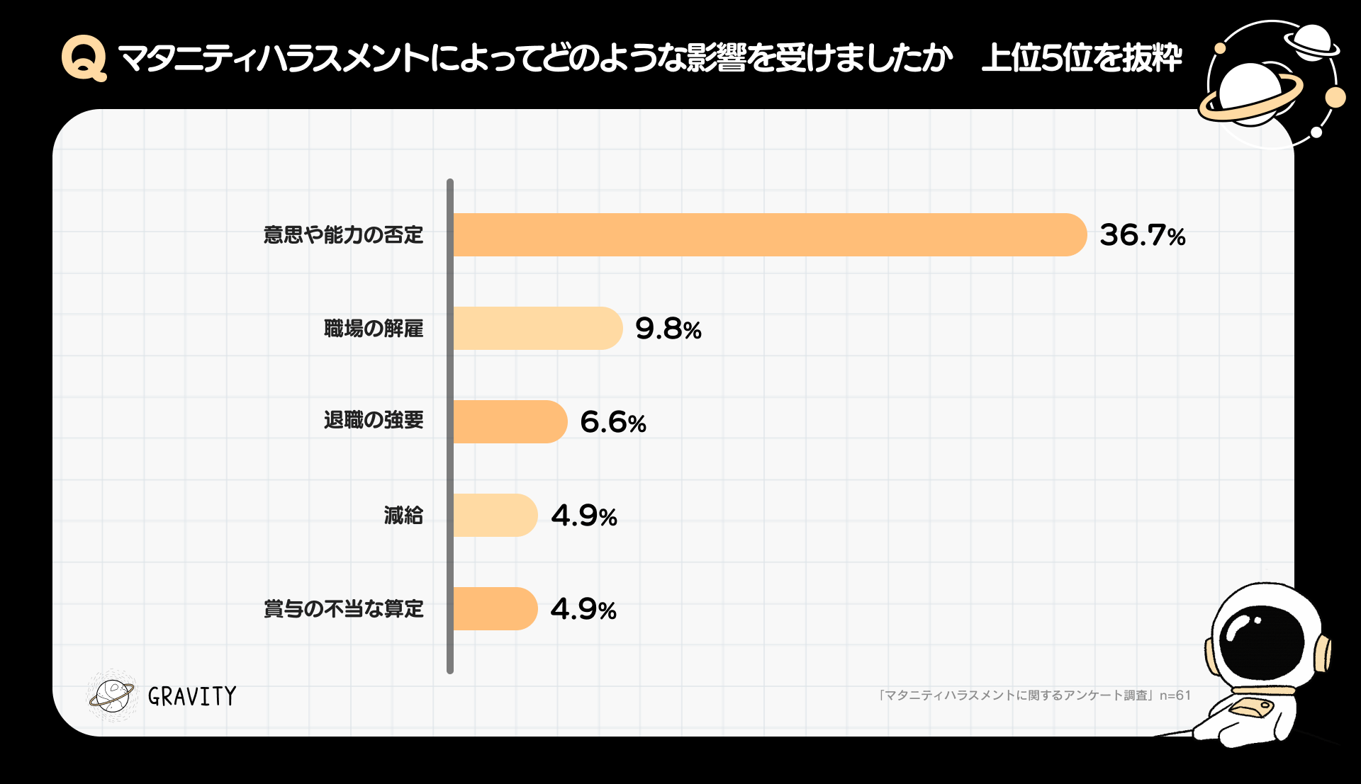マタニティハラスメントによって受けた影響は「意思や能力の否定」が36.7%と最も多く、その他としては、「仕事量を増やされた」「陰口」との声が寄せられました。