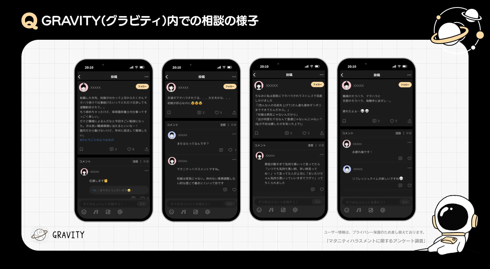 当社が運営する『GRAVITY(グラビティ)』では、誰かに個人を特定される心配がなく気楽に投稿できる安心な環境なため、周囲に相談しづらいマタニティハラスメントについても相談やアドバイスが行われています。近しい間柄では相談しづらいことや誰かにちょっと聞いてほしい悩みなど、安心安全な環境が整っている『GRAVITY(グラビティ)』で相談してみてはいかがでしょうか。