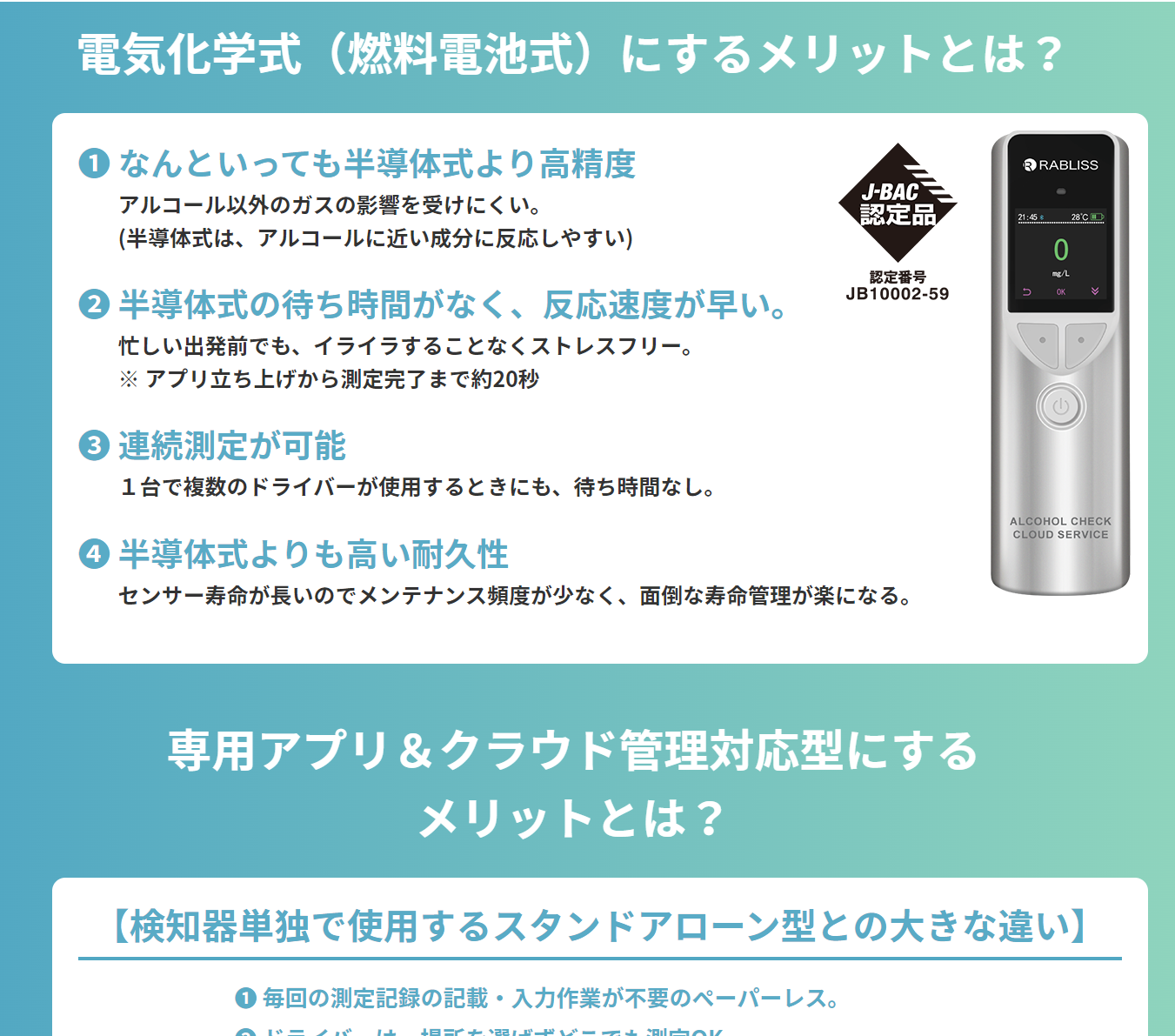 高精度、高耐久のセンサーにより、信頼ある検知能力を誇る、アルコール検知協議会認定機器です。(認定番号:JB10002-59)