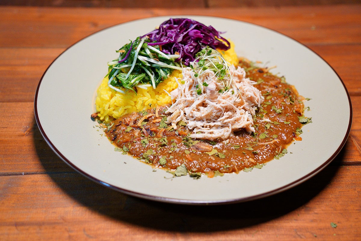 スパイスソムリエの店主が緻密に計算し配合したスパイスを使用した自慢の無水カレーに、国産の上質な胸肉を丁寧に炊きあげ秘伝のガラムマサラと塩で味付けをした特製マサラチキン。そして、栄養価満点のスプラウト野菜を添えております。