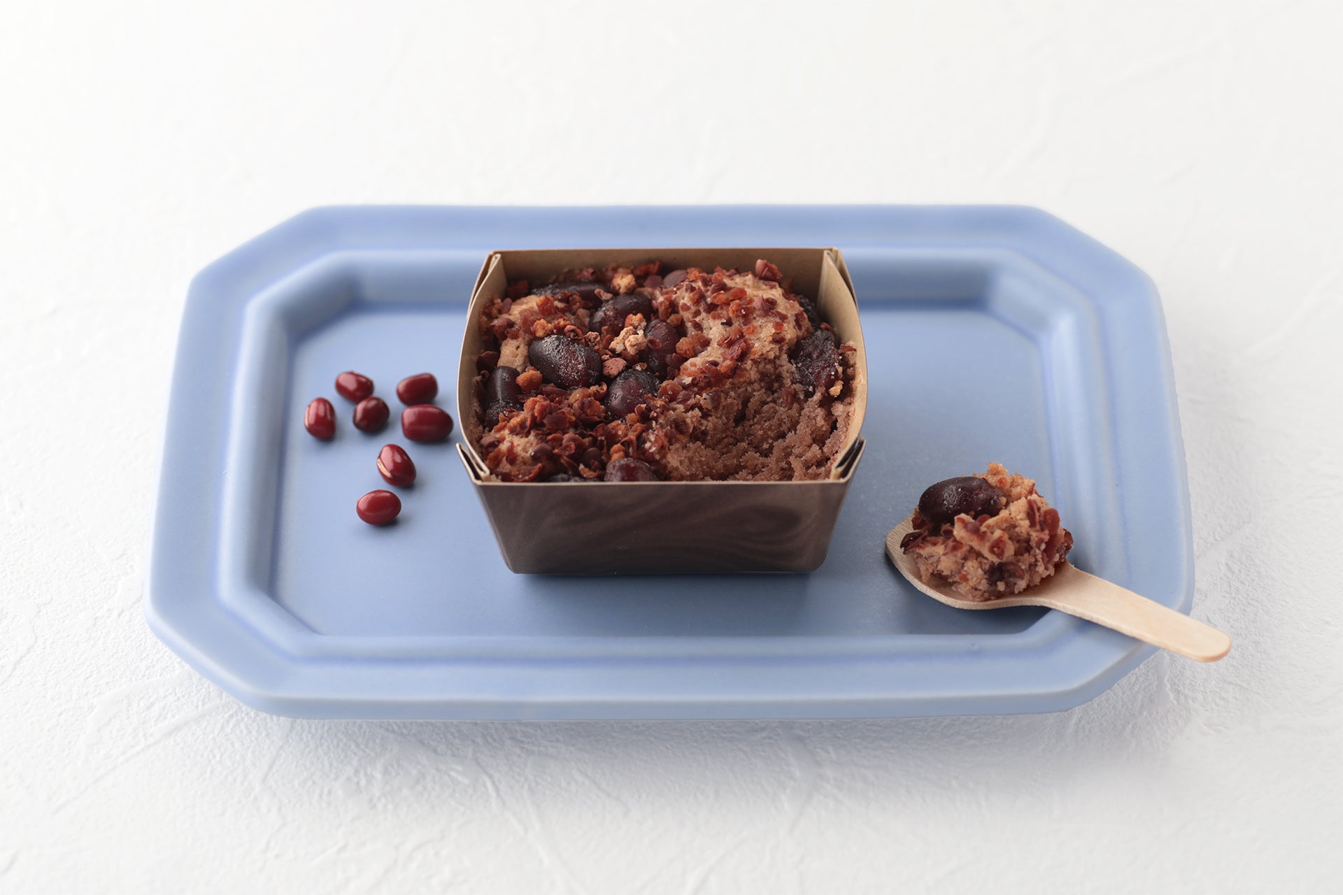 「あんこばこ」は、自家製のあんこに、バターや卵などを加えて焼き上げた、和のカップケーキです。ベースとなる生地には、北海道産の小豆を、美十のあんこ職人が丁寧に炊き上げた自家製こしあんを使用しています。そこに、あずきの甘納豆、アーモンド・ピスタチオ・ピーカンナッツの3種類のナッツ、愛媛県産の甘夏のドライフルーツ、いちごのフリーズドライといった4種類の多彩なトッピングを合わせました。それぞれの素材が持つ風味と食感が、絶妙なバランスで調和する、和と洋の美味しさを結んだスイーツです。