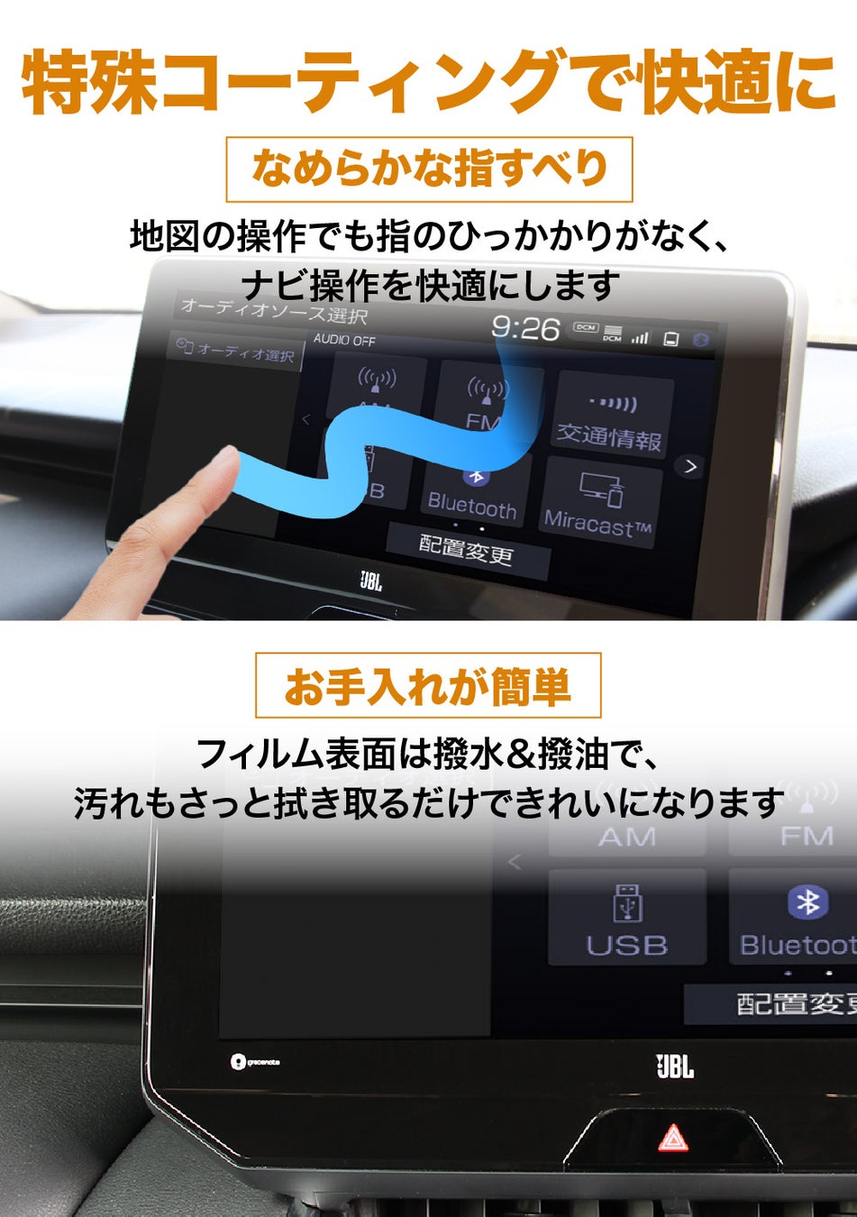 特殊コーティングにより、地図の操作でも指のひっかかりが少なく、ナビ操作を快適にします。