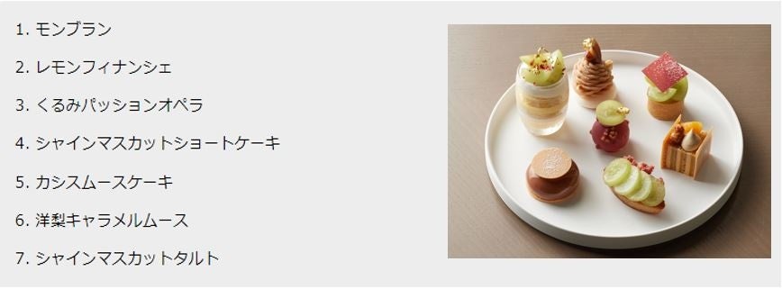 瑞々しいシャインマスカットにピンク色のカシスのチョコレートやラズベリームースを合わせ、夏の名残りの中で凛と咲くお花のように可憐なスイーツの数々。シャインマスカットやカシスの爽やかさにカカオの後引く甘味が相まった華やかなスイーツはペストリーの魔術師とも呼ばれるエグゼクティブペストリーシェフ青木 裕介が手掛けております。また、くるみや洋梨を使ったスイーツや、秋のスイーツには欠かせないモンブランは小さいながらもしっかりとしたコクで、これから始まる秋の芳醇な味わいをお楽しみ頂けます。