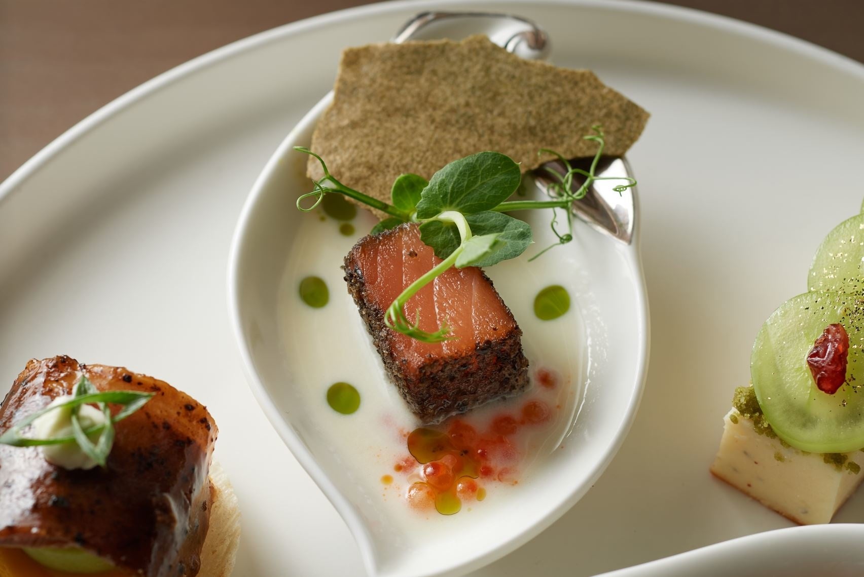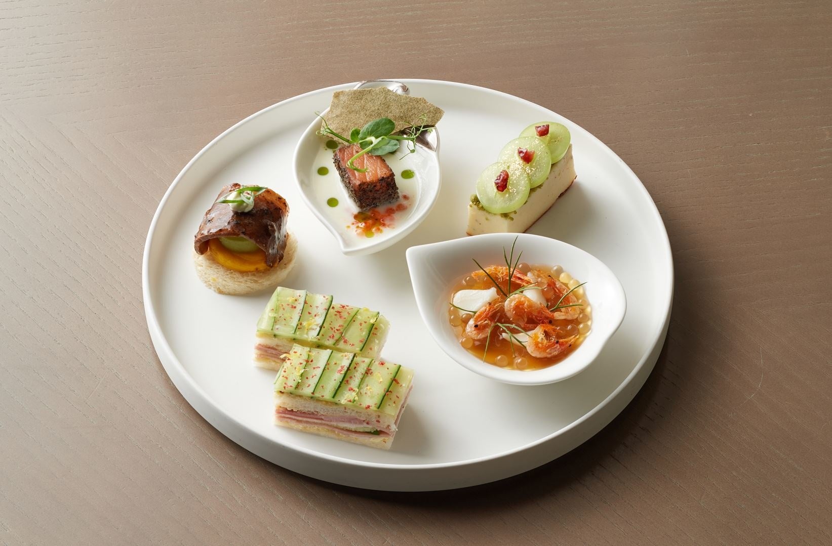秋旬の素材の風味が引き立つ味わいの5品のセイボリーはホテルのバンケットシェフ 平野 覚が担当いたしました。「和」と「洋」の食材を巧みに使いこなし、絶妙なハーモニーを奏でるセイボリーはオープン当初からご好評をいただいております。