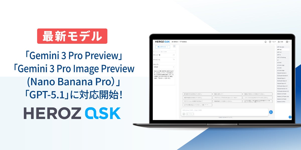 「HEROZ ASK」にて、Gemini 3 Pro Preview/Gemini 3 Pro Image Preview(Nano Banana Pro)、GPT-5.1を追加費用なしでご利用いただけます。