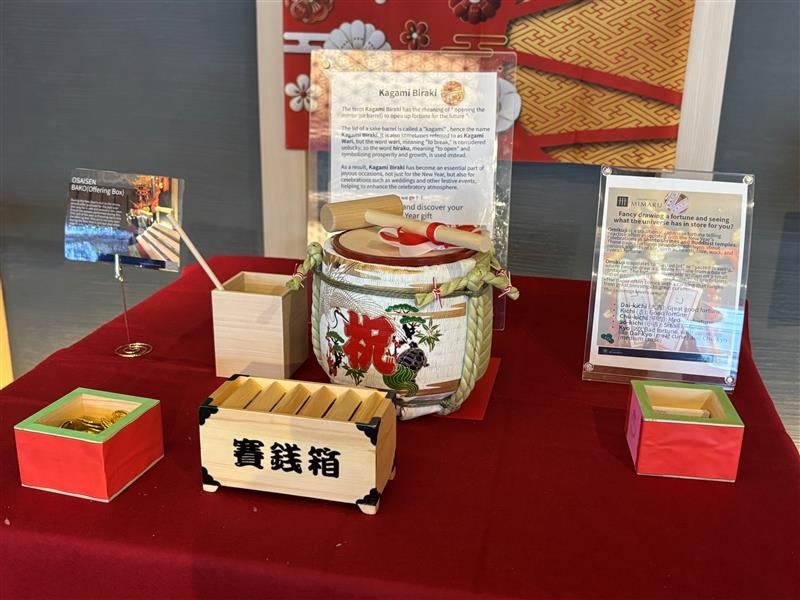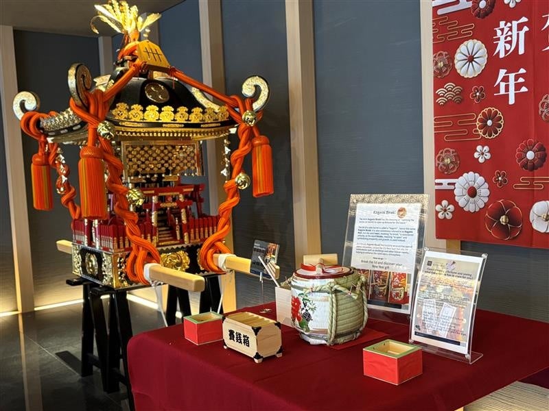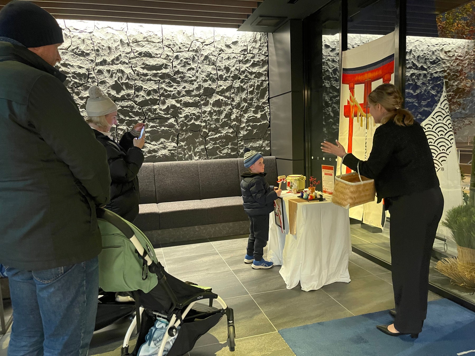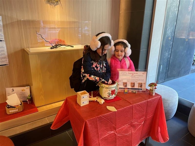 「鏡開き」は、日本のお祝い事に行われる伝統的な儀式です。木槌で酒樽の蓋を割り、みんなで酒を分け合い幸運を祈るこの儀式を、「MIMARU」ではお子さまも楽しめる形にアレンジしました。小槌で朱桶の蓋を開けると中にはお菓子やギフトが詰まっています。柄杓ですくって升に入れてお渡しするという楽しい演出を加えました。ロビーには「よいしょー」というスタッフの掛け声が響き、小槌を手にした子どもたちが次々とチャレンジ。日本のお正月文化を体験する家族が集まり、元旦から7日間、賑やかで温かな雰囲気に包まれました。