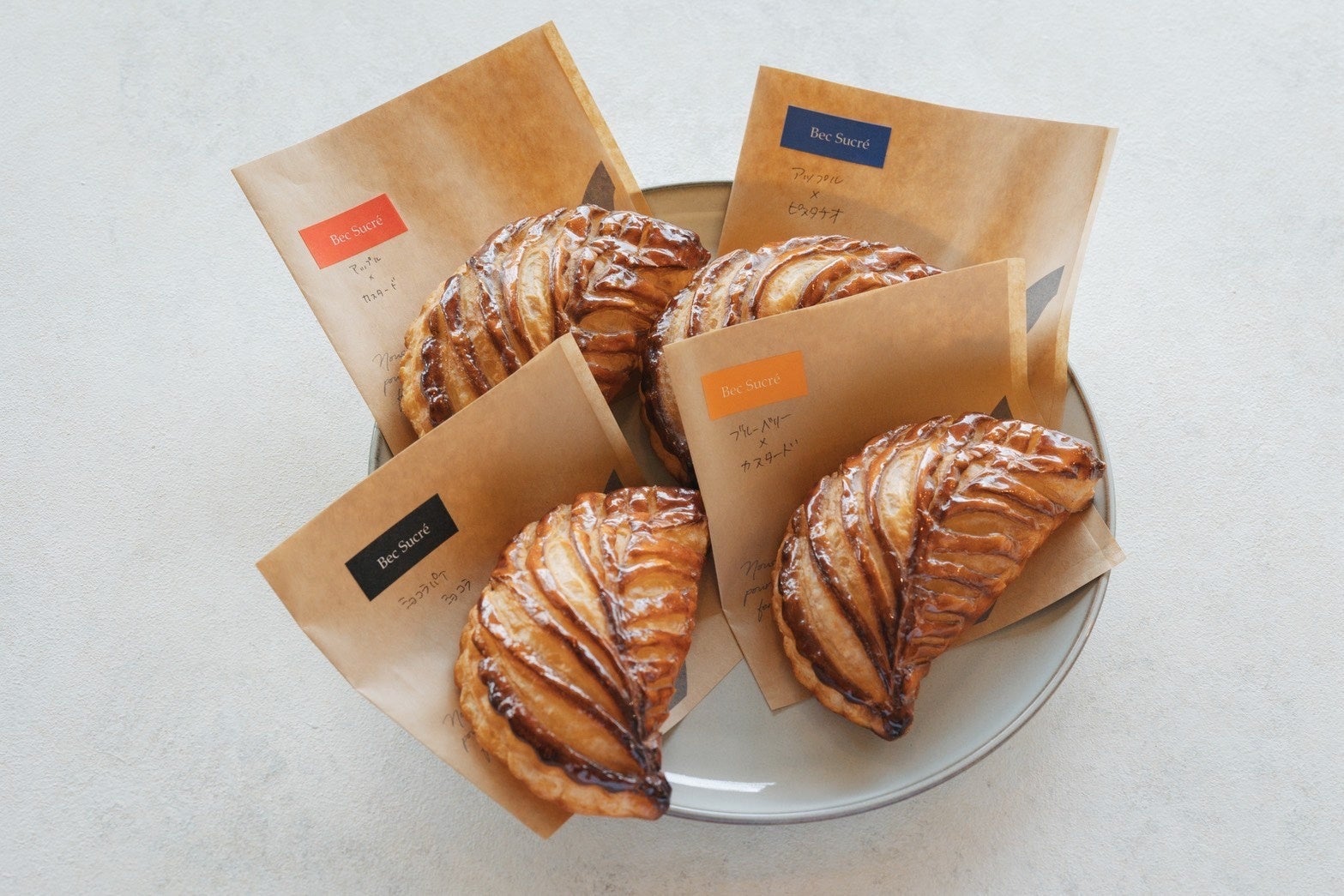 青森県産りんごを砂糖のみで(シナモン他不使用)じっくりキャラメリゼし、香ばしいサクサクのパイ生地に包み込み、こだわりのクリームをたっぷり詰めたアップルパイ。クリームは、カスタード、ショコラ、ピスタチオの計3種類をご用意。