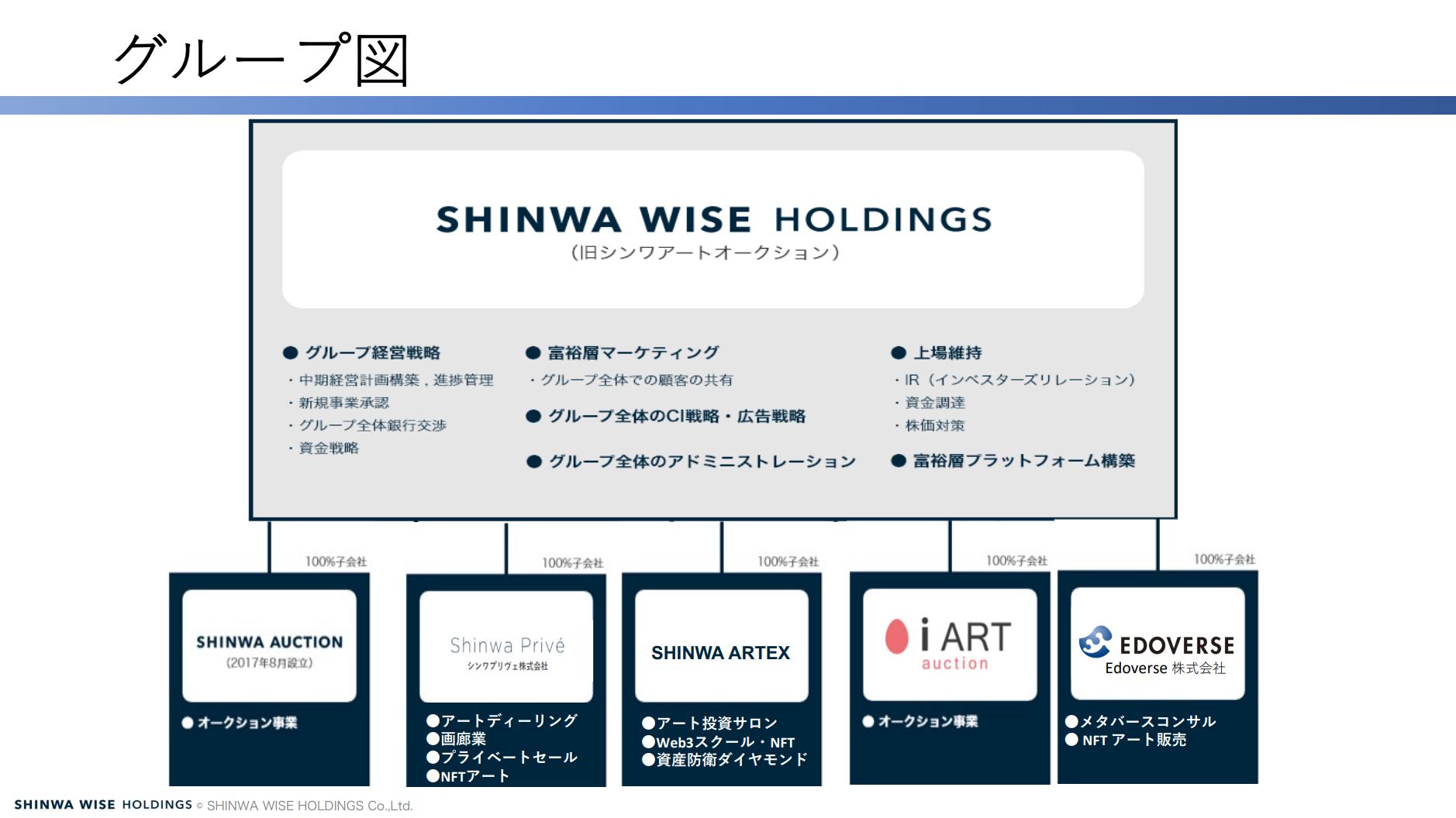 2017年12月 会社分割により持株会社へ移行。Shinwa Auction株式会社がShinwa Wise Holdings株式会社の100%小会社化