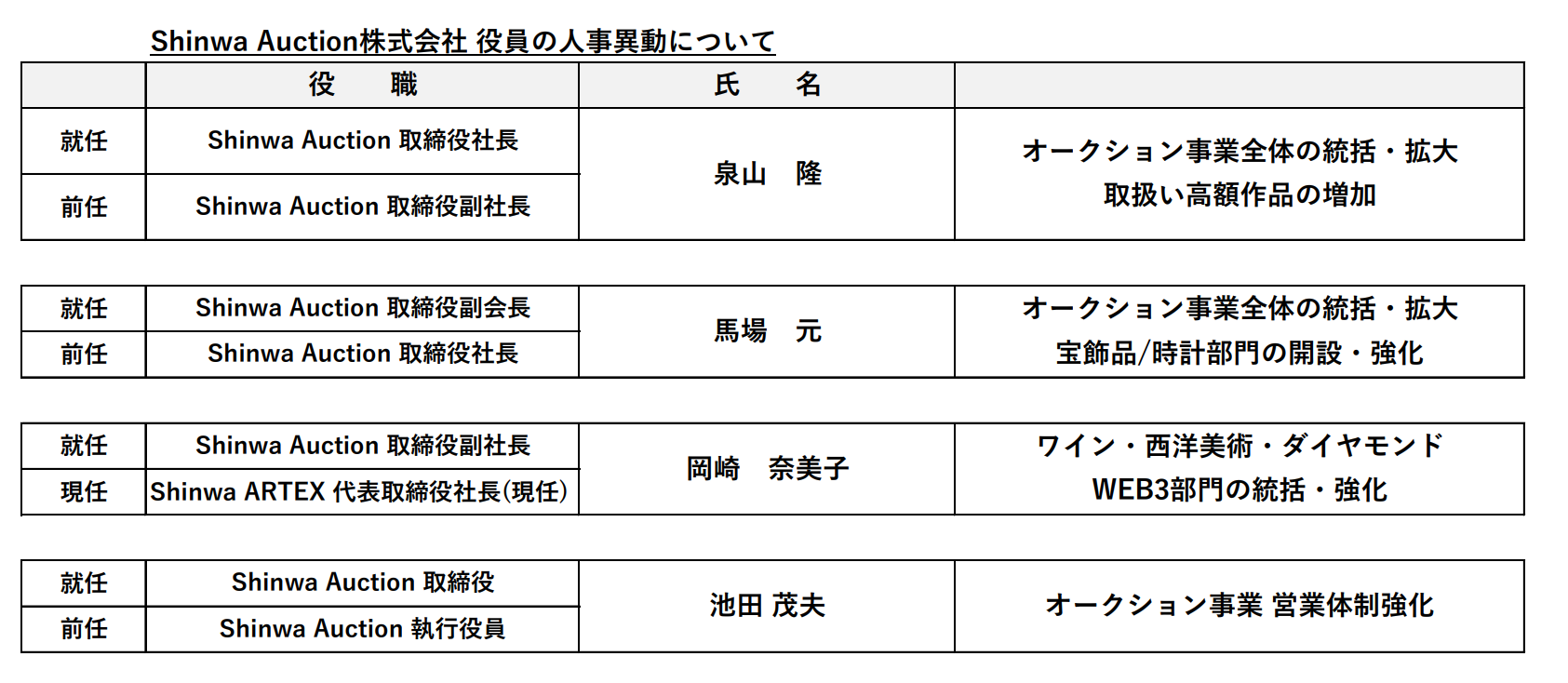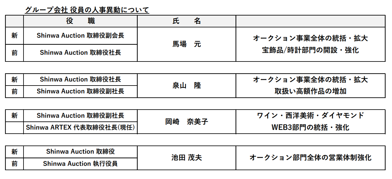 Shinwa Auction株式会社は、以下の人事異動を実施しました。