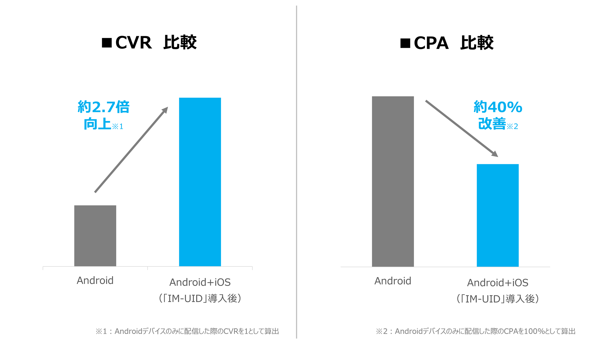 この連携により、「Logicad」において、ユーザーのプライバシーを保護しながらiOSデバイスにターゲティング広告を配信することが可能になりました。配信先が拡大し、アプローチできるユーザーが増えることで、さらなる広告効果向上が期待できます。実際に、SMNが「IM-UID」を活用したターゲティング広告のテスト配信を行ったところ、テスト配信の結果、AndroidデバイスだけでなくiOSデバイスにもターゲティング広告を配信することで、imp数・CV数が増加することを確認いたしました。また、以下の事例では、CVR・CPAの改善が見られました。