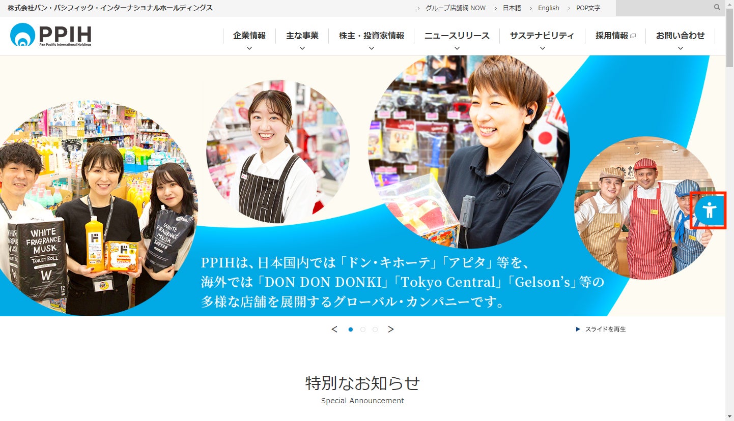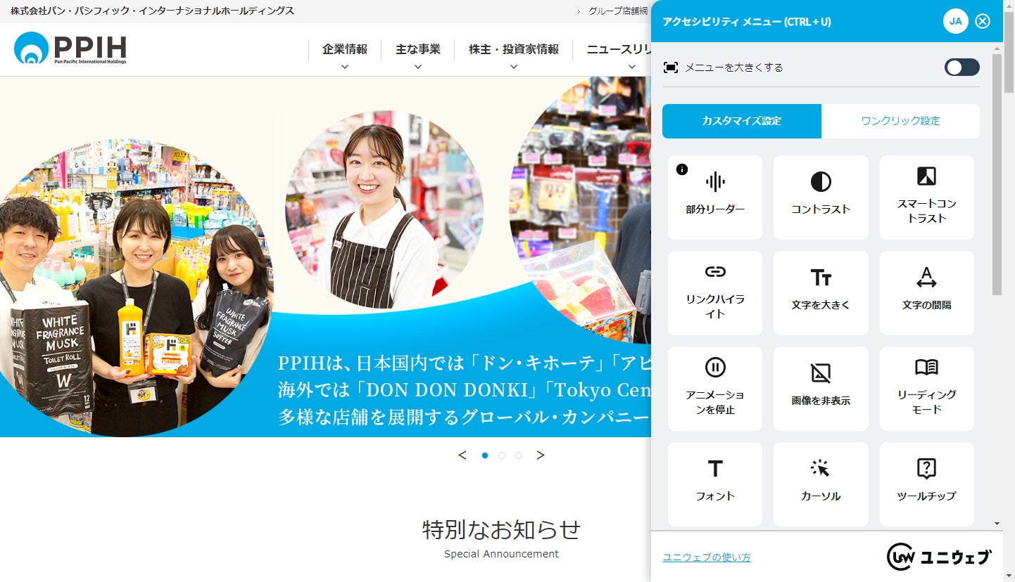 株式会社Kiva(本社:東京都中央区、代表取締役社長:野尻 航太、以下 Kiva)は、株式会社パン・パシフィック・インターナショナルホールディングス(本社:東京都渋谷区、代表取締役社長CEO:吉田 直樹、以下 PPIH)が運営するコーポレートサイトに、ウェブアクセシビリティツール「ユニウェブ」が導入されたことをお知らせいたします。