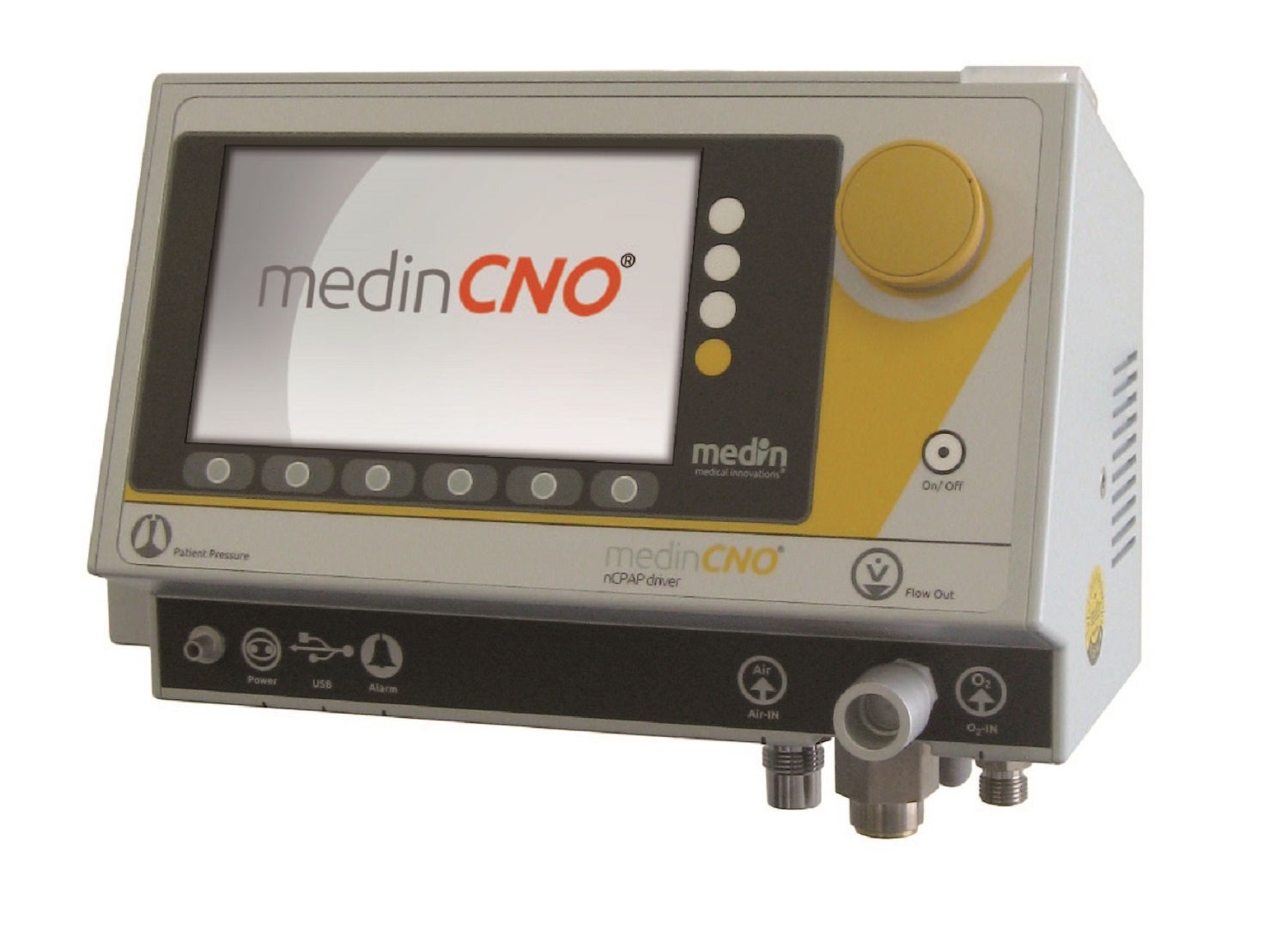 medin-CNOは新生児及び小児のn-CPAPに用います。medin-CNOは通常のn-CPAPの他、患者の無呼吸に反応するアプネアCPAPモードや自発呼吸に同調させるSNIPPVモード、n-CPAPに振動を重ねるオシレイトモードを有します。またバックアップ換気を有することで新生児無呼吸発作に対応できるため、早期抜管や再挿管のリスクを低減することが期待できます。