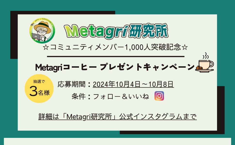 Metagri研究所は、コミュニティメンバー1,000人突破を記念して、公式Instagramをフォローしキャンペーン投稿に「いいね」をすることで、抽選で3名様へMetagriコーヒーをプレゼントするキャンペーンを開催します。応募資格は日本国内在住のInstagramユーザーで、公式アカウントをフォローし、投稿が公開設定であることです。