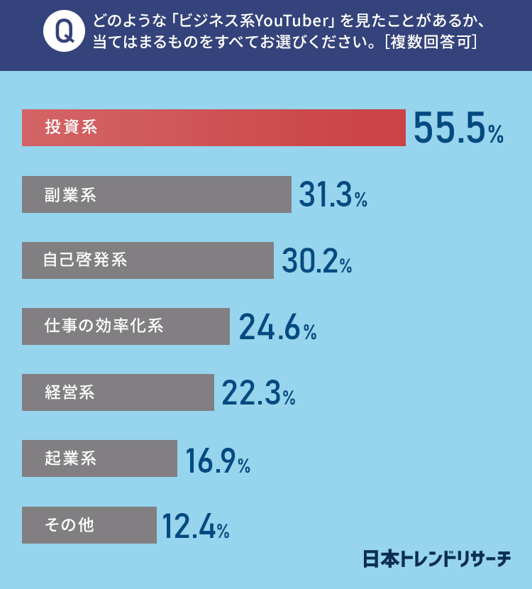 その中でも「投資系」のチャンネルを見たことがある方が55.5%と、もっとも多いようです。