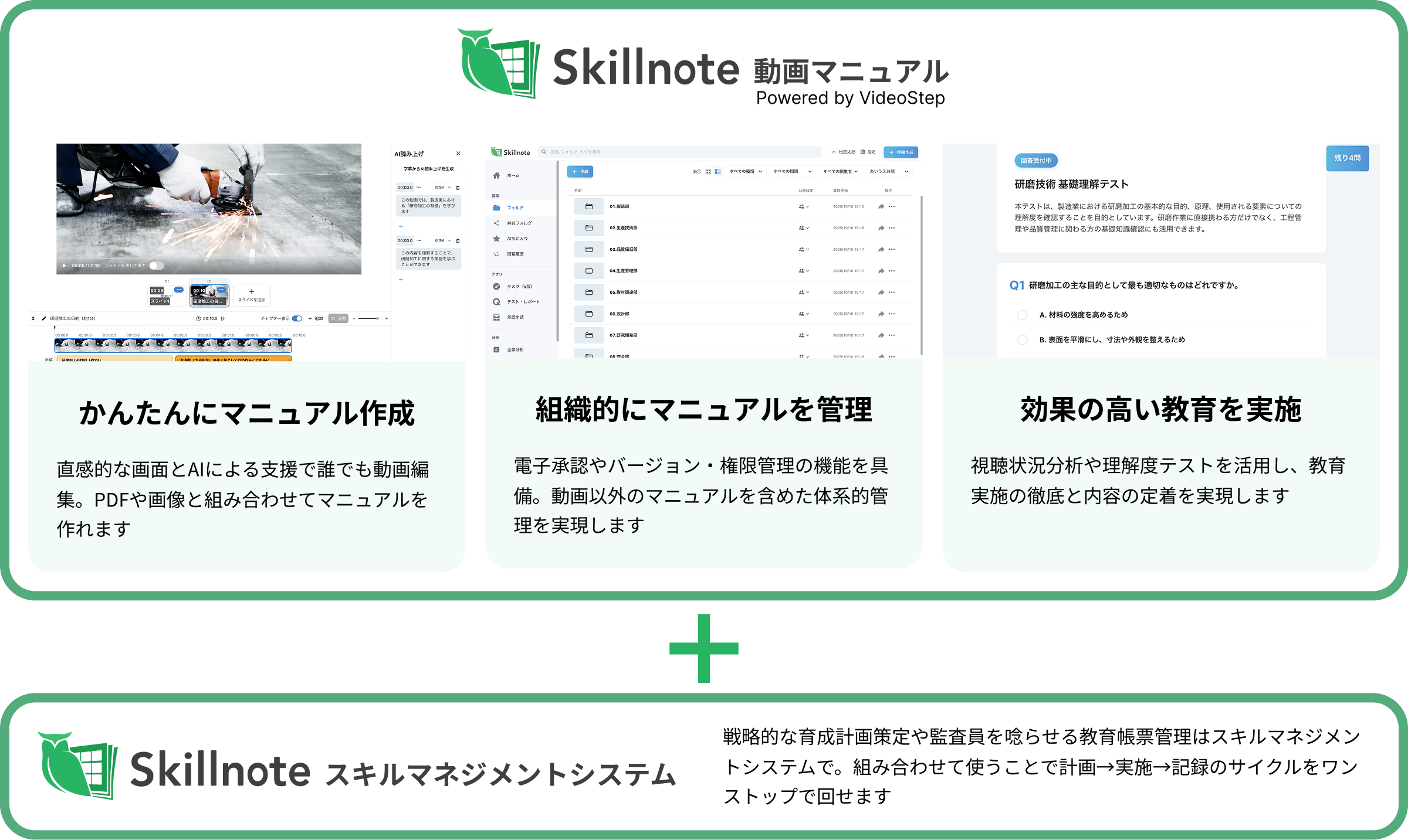 さらに、「Skillnote スキルマネジメントシステム」と組み合わせて使うことで、教育の実施にとどまらず、計画→実施→記録のサイクルをワンストップで回すことができます。これにより、技能伝承や業務標準化等の育成課題に対する戦略的な取り組みを実現します。