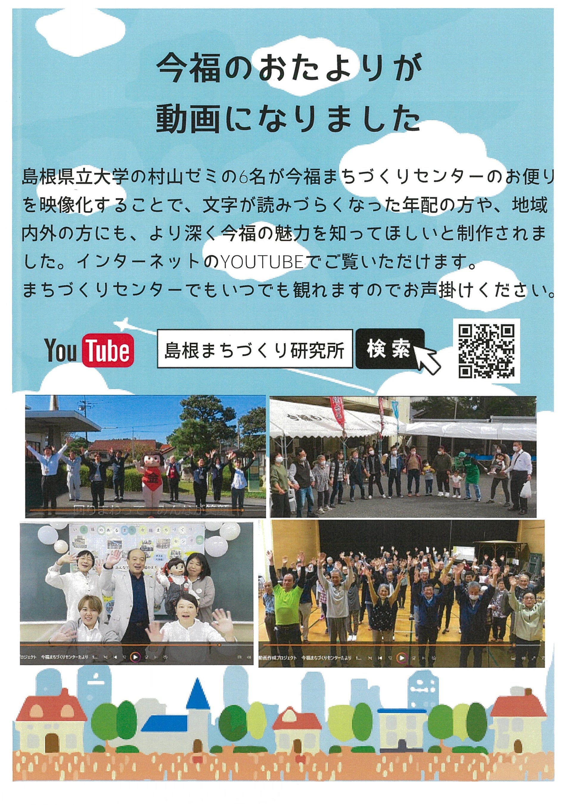 ・今回の動画撮影を通して、今市・今福ともに、地域の方やセンター職員さんとのコミュニケーションをこれまで以上に取ることができたように感じました。また。見てくださる住民の方に、いかに今市らしさ、今福らしさを動画で提供できるかを念頭に置いて撮影することができたと思います。(2回生)