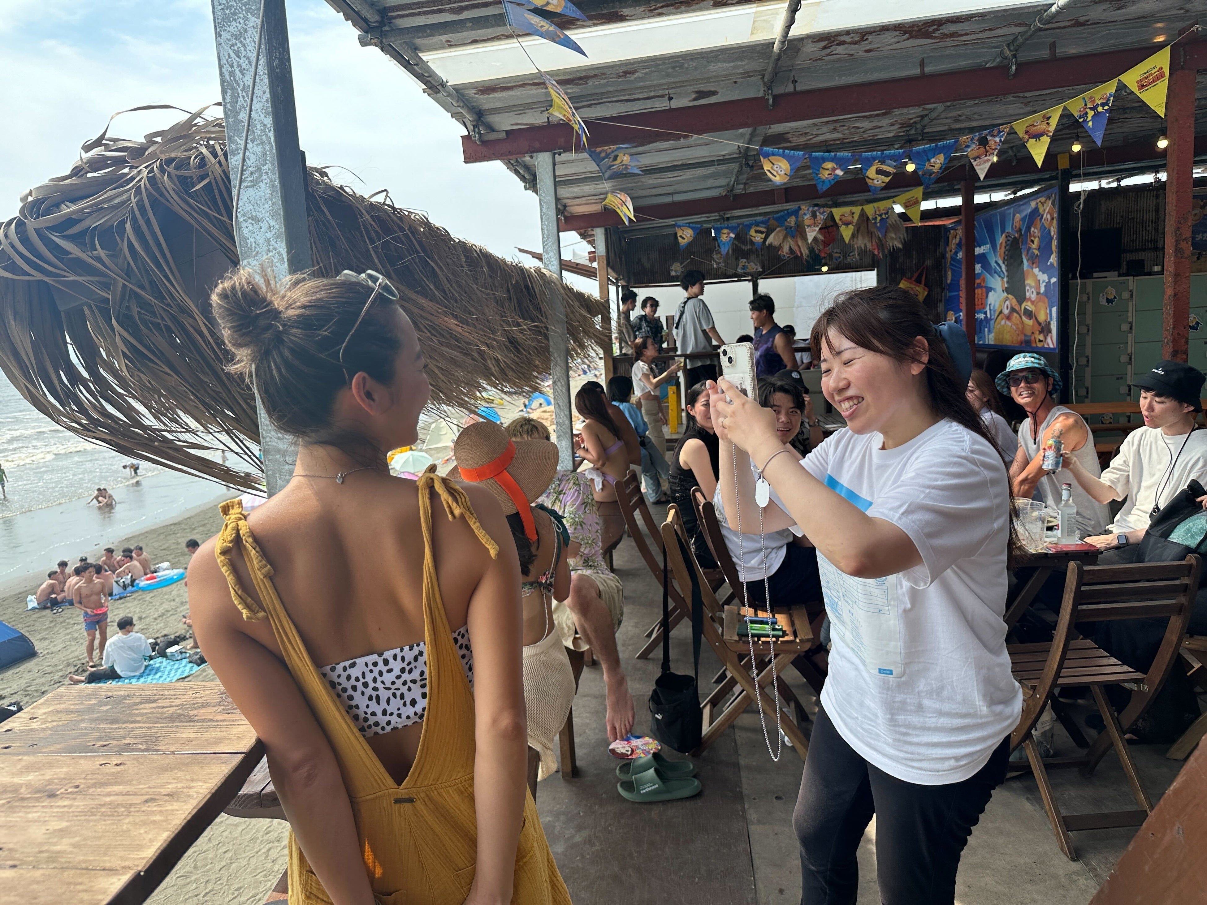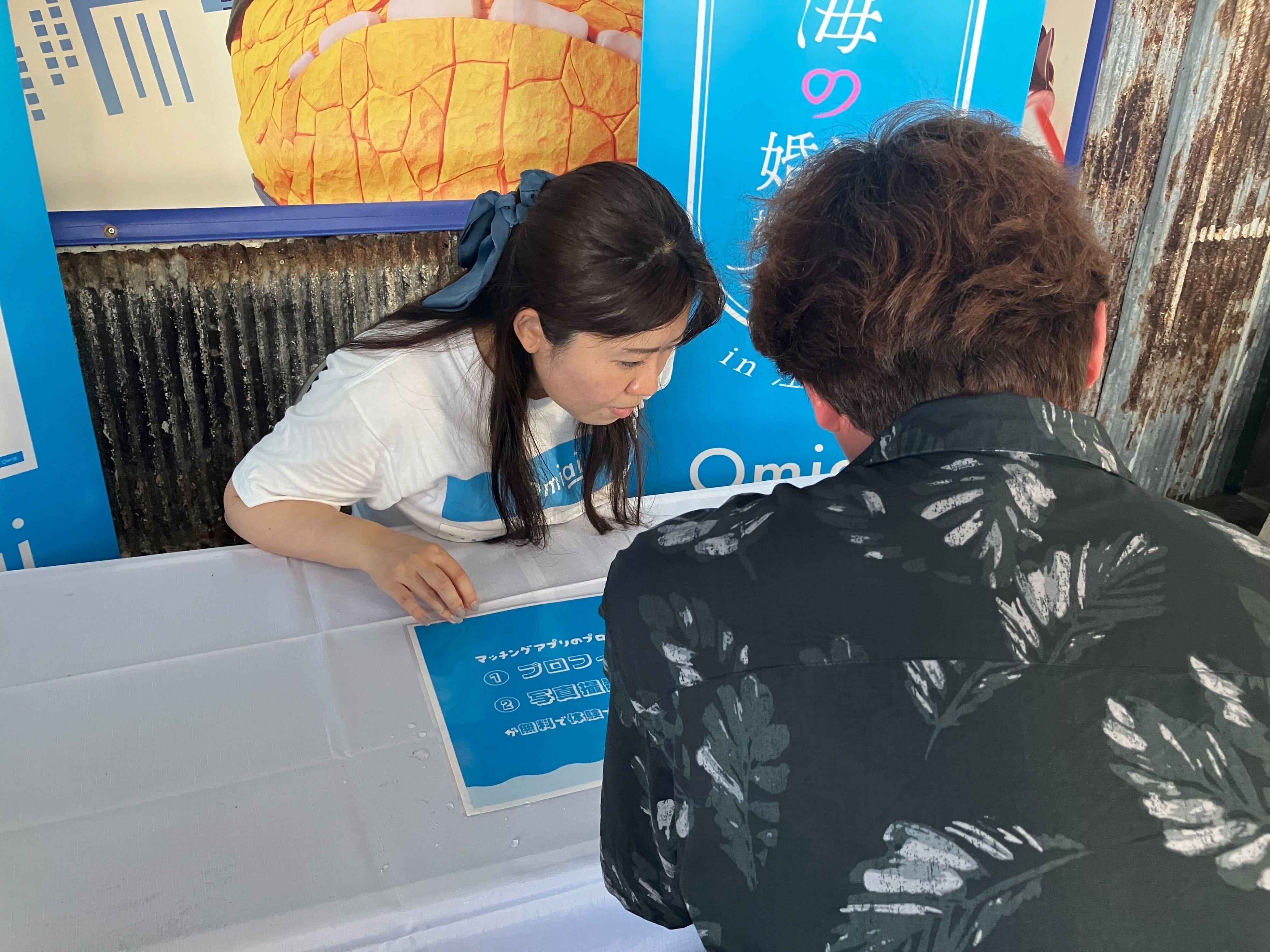 「海の家 PLAY THE EARTH」内でブースをたて行った「海の婚活相談所」では、マッチングアプリアドバイザーからプロフィール添削やOmiaiに適した海辺での写真撮影などを行いました。