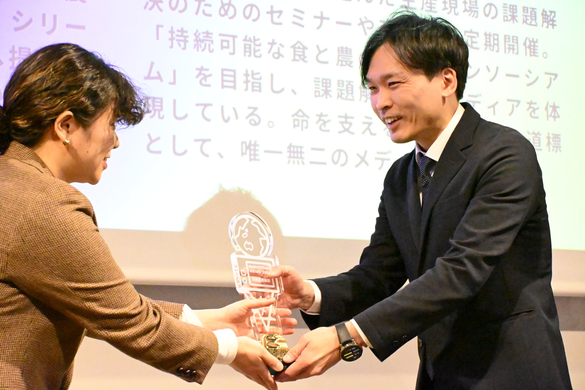 同賞は23年に創設され、気候変動報道を支援する一般社団法人「Media is Hope」が主催。2月25日に東京都渋谷区の国連大学で開かれた表彰式には、日本農業新聞デジタルイノベーション室の岡部孝典次長(みどりGXラボ事務局長)が出席し、「気候変動による温暖化は農家の大きな課題。報道やみどりGXラボの活動を充実させ、解決に貢献したい」と述べました。