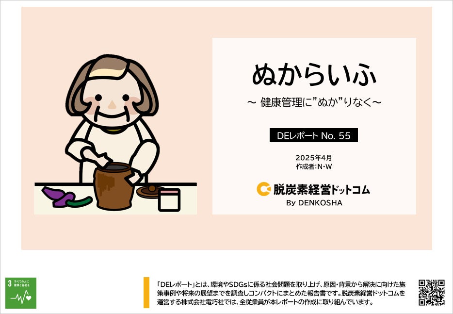 「RE100」の中小企業版「RE Action」に加盟し、脱炭素経営を推進する電巧社(本社:東京都港区、代表取締役社長:中嶋 乃武也)が運営する「脱炭素経営ドットコム」監修で、ぬか漬けの健康効果に関する実態調査を行い、レポートとしてまとめました。