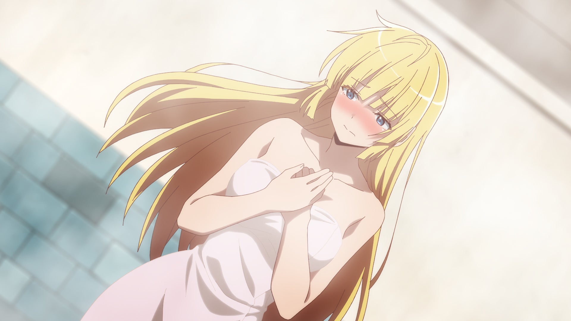 第12話では「スタンピード」を止めたアンジェリカ(CV:早見沙織)と仲良くなりたいと思ったクラスの女子たちは、一緒にお風呂に入るため鎧を脱がしてあげるが、そこには骸骨ではなく生足が…。