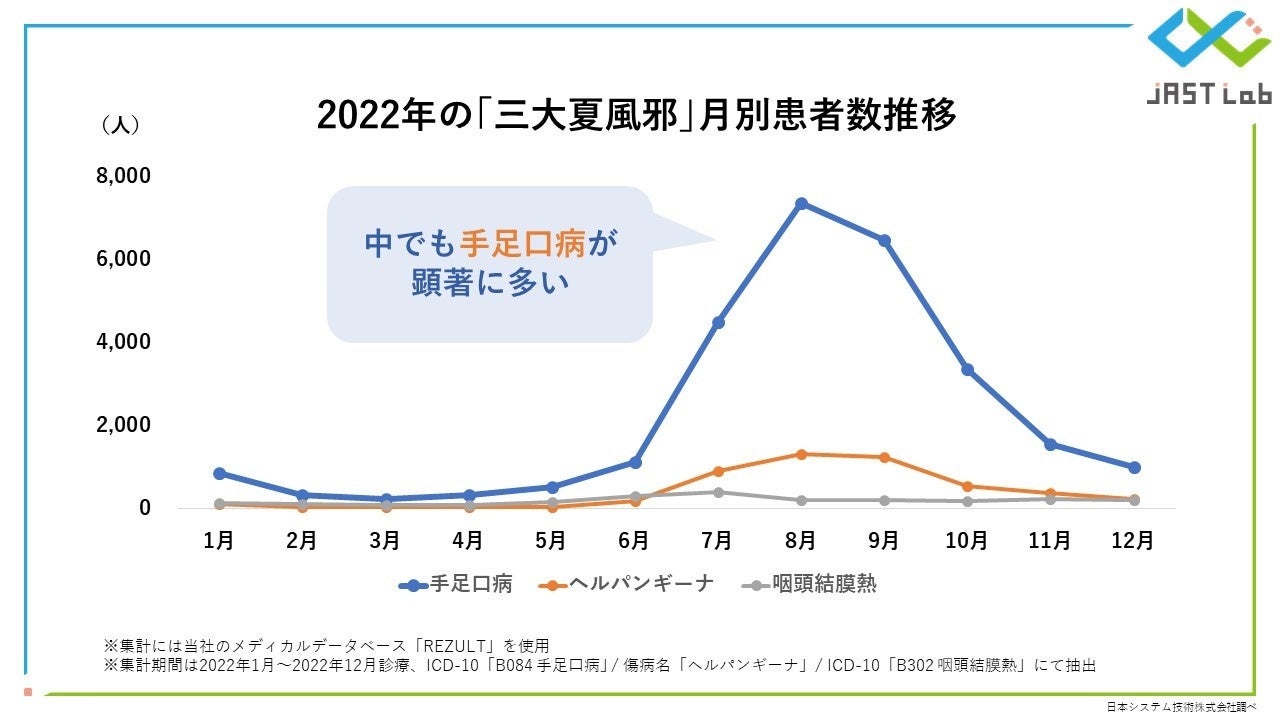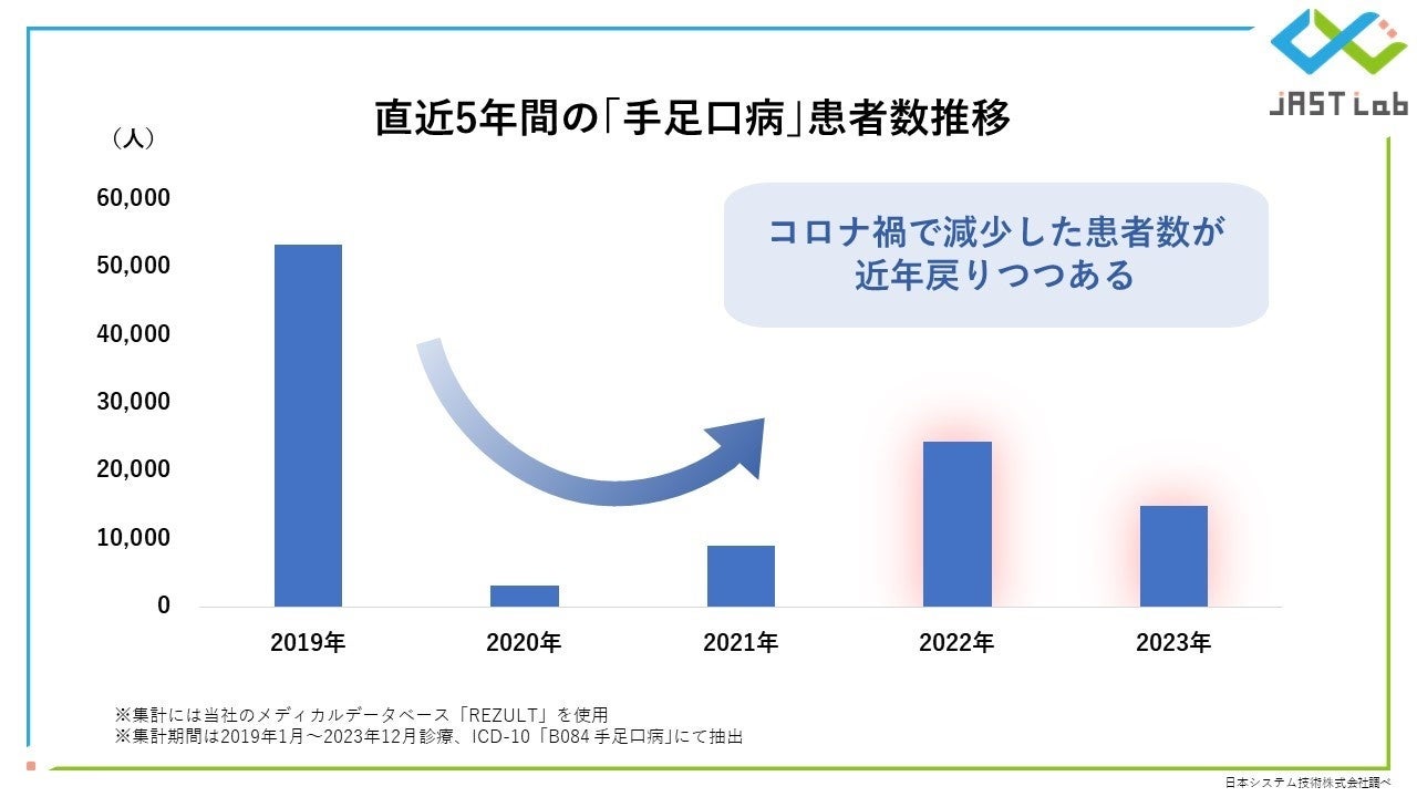 本レポートでは、データという視点から手足口病をさらに深く理解することを目指し、当社のメディカルビッグデータを用いて患者動向を分析いたしました。