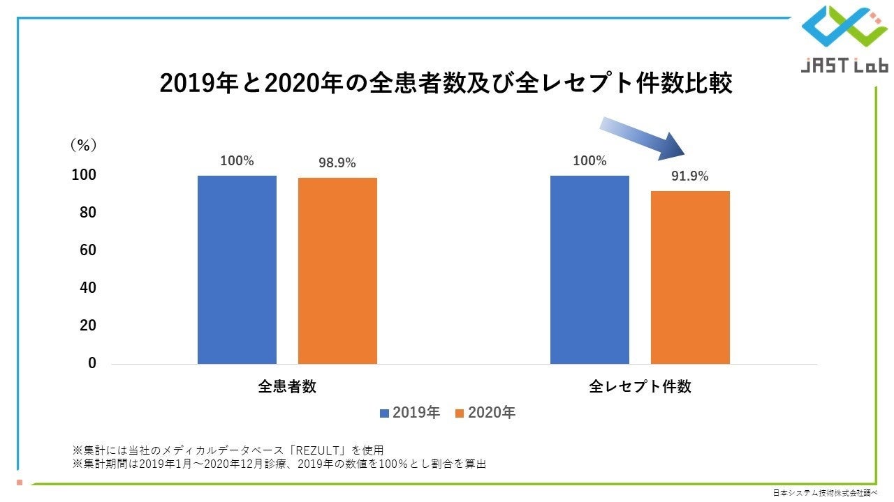 一方で、2019年と2020年の全患者数及び全レセプト件数を比較すると、全患者数は昨対比98.9%、レセプト件数は昨対比91.9%となっており、患者数に比べてレセプト件数の減少傾向が強いことがわかりました。これは、一人当たりの受診回数が減少したことを示しています。この要因として、コロナ禍による医療機関の受診控えが影響していると考えられます。これは、手足口病患者の大幅な減少にも関連している可能性があります。