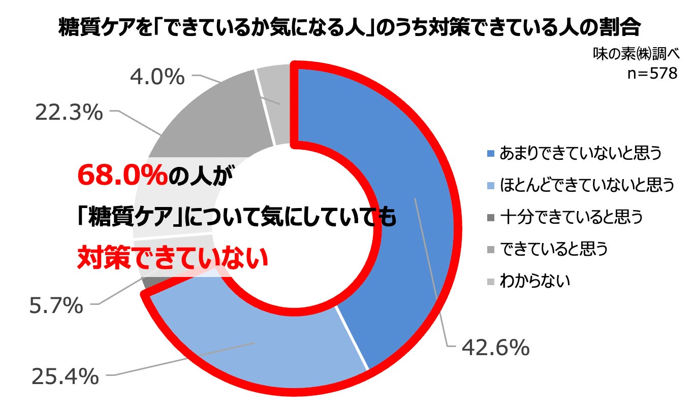 「糖質ケア」への関心が高い層が半数以上であった一方で、そのうちの68.0%が「糖質ケア」ができていないと回答。意識と実態のギャップが浮き彫りになりました。