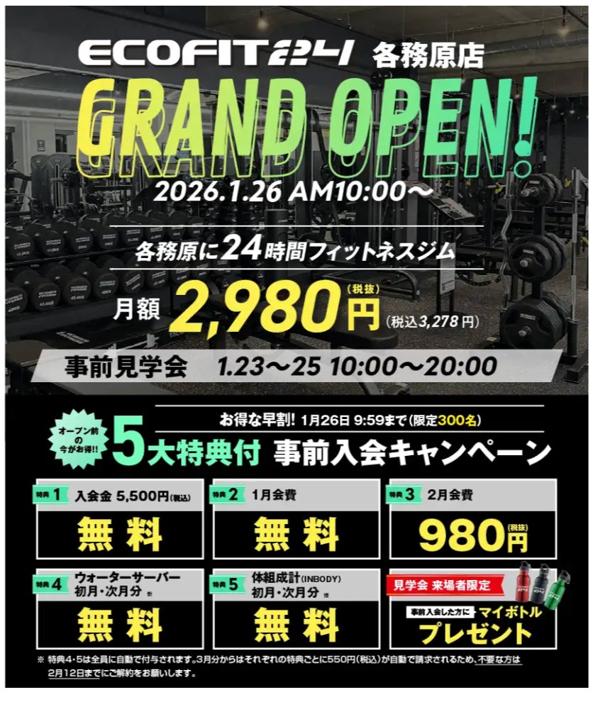「エコフィット24」各務原店では、グランドオープンを記念し、先着300名様限定で最大9,500円相当がお得になる事前入会キャンペーンを実施しています。