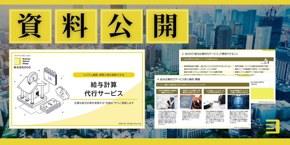 人×テクノロジーで社会の原動力となり「人をつなげる 未来へつながる」の実現を目指す株式会社BOD(本社:東京都豊島区、代表取締役:田中大善)は、2月18日に「給与計算代行サービス」に関する資料を公開しました。給与計算におけるお悩みを解決できる当社サービスの詳細と、事例や実績、給与計算と深く関わりのある年末調整やマイナンバー、住民税についても記しておりますので、ぜひご活用くださいませ。