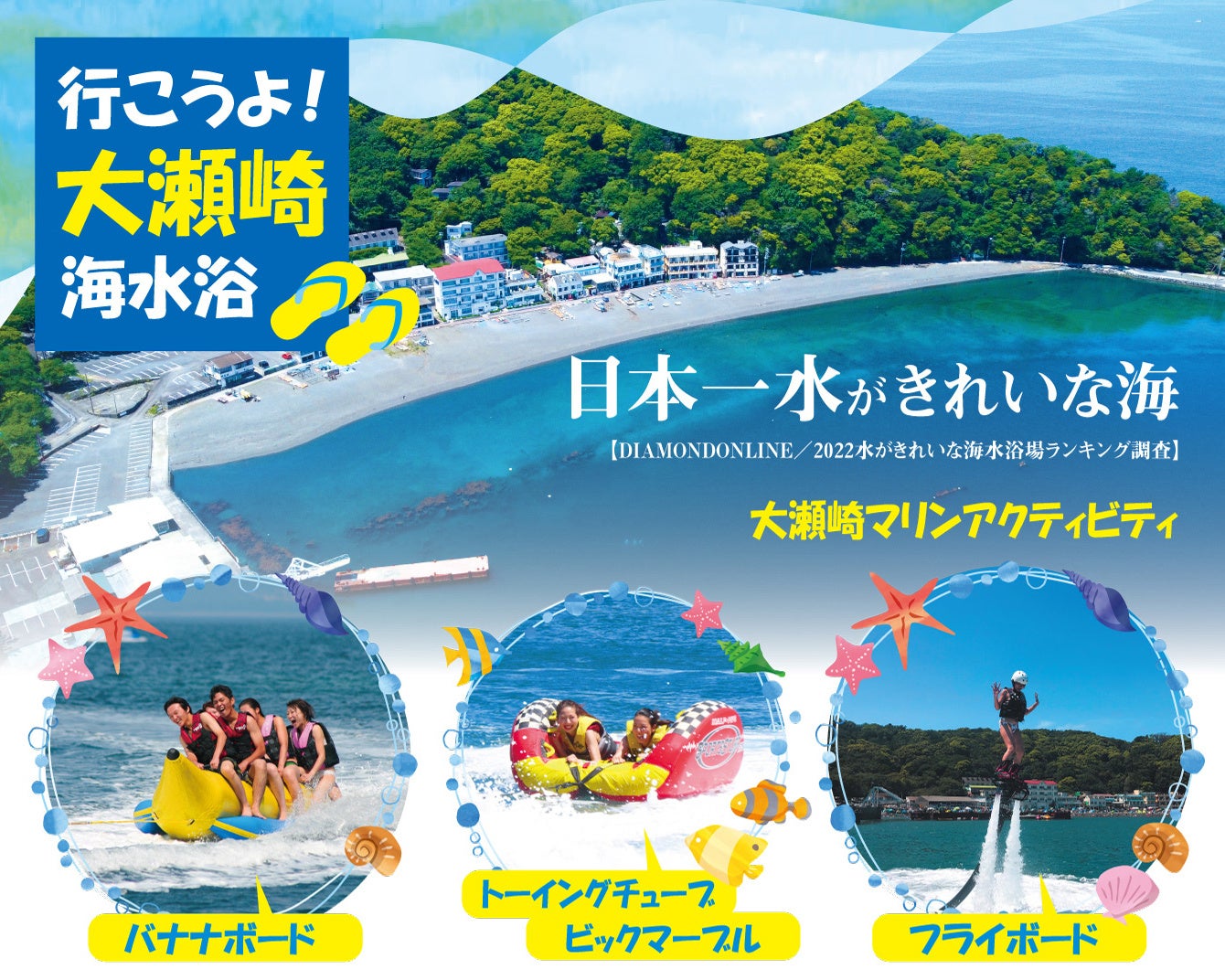 さらに、「水がきれいな海水浴場ランキング※」で2年連続1位に選ばれている「大瀬海水浴場」では、バナナボートやフライボードをはじめとした「マリンアクティビティ」の他、温水シャワーも完備した「ちどりマリンサービス海の家」、新鮮な食材をふんだんに使った「ビーチサイドテラスBBQ」や「RVパーク」の営業を行っています。また、大瀬海水浴場は砂利ビーチのため、砂汚れ知らずで、ご帰宅後の水着の洗濯が楽なのも嬉しいポイントです。今年は日本一きれいな「大瀬海水浴場」で夏の思い出を作りませんか?