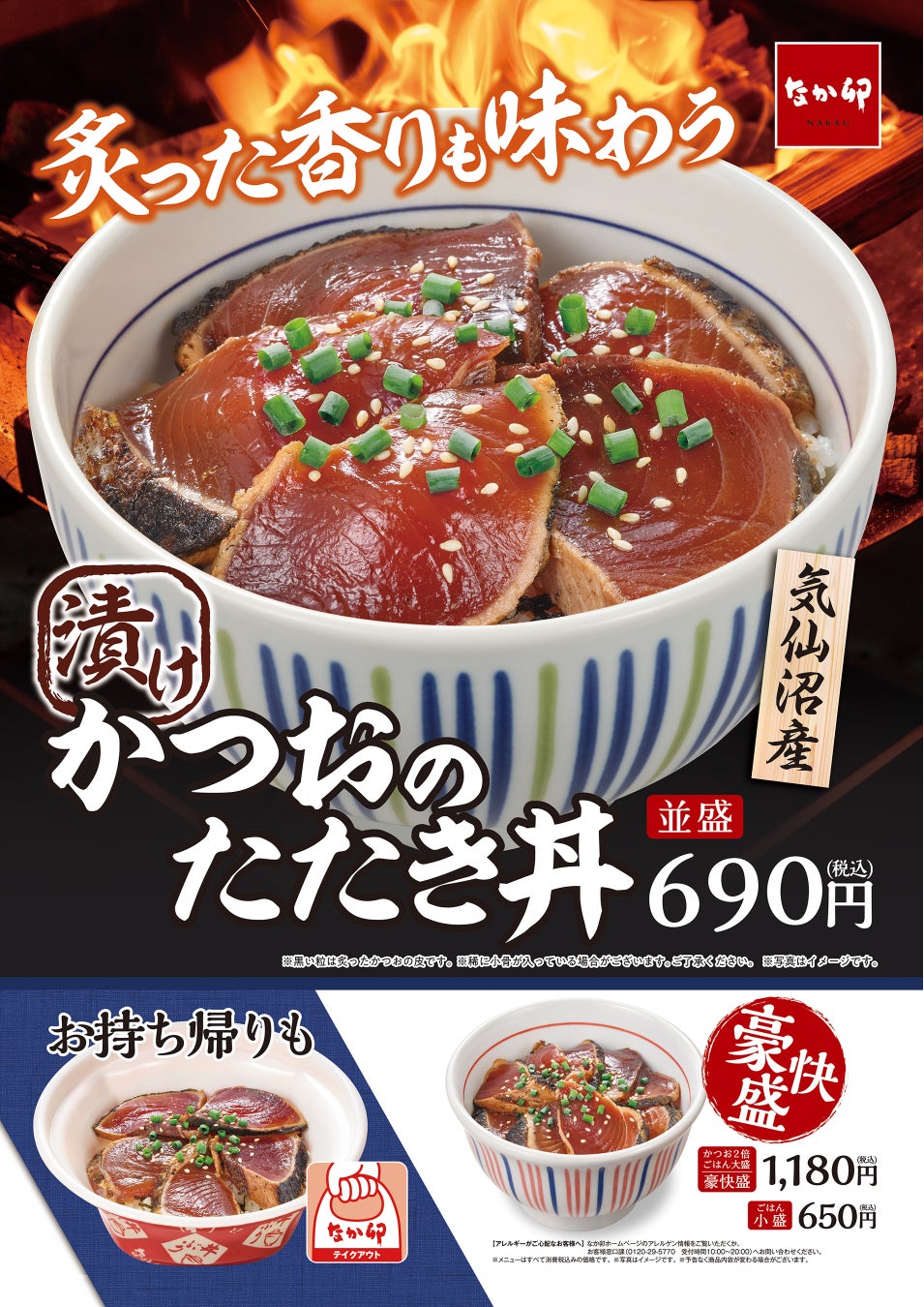 株式会社なか卯(代表取締役社長:平山 賢太郎 本社:東京都港区)が展開する丼ぶりと京風うどんの「なか卯」では、10月20日(木)AM11:00より「かつおのたたき丼」を販売します。