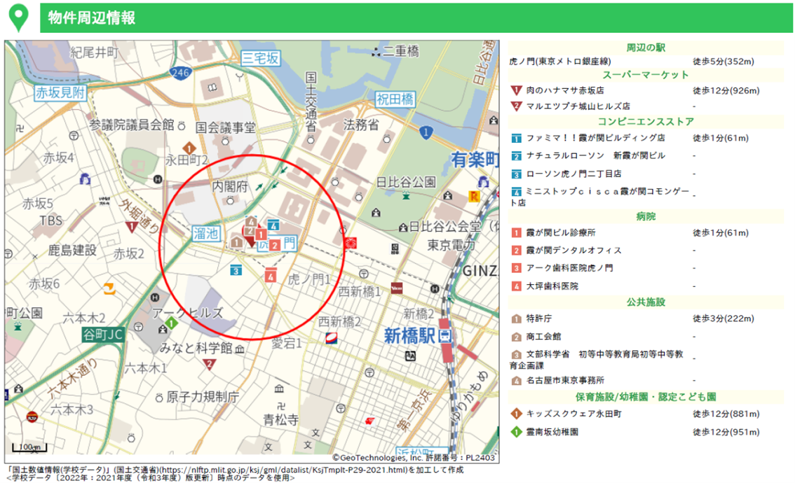さらに、ジオテクノロジーズの高精度かつ印刷可能な地図データによって、物件とその周辺の地域情報を視覚的に分かりやすく表現し、最適な物件を提案することを手助けします。