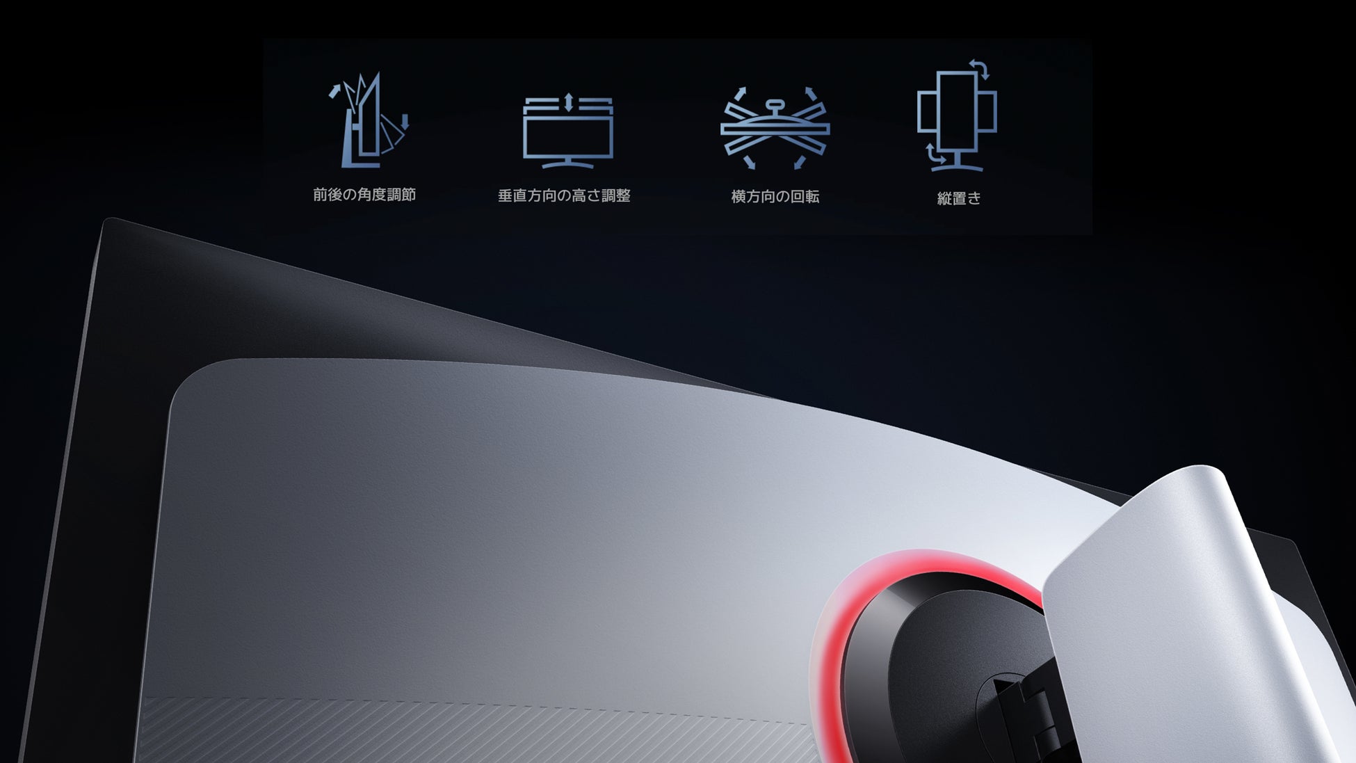 ゲームプレイヤーの嗜好を意識し、最大限に狭めたベゼルによる広範囲の視野や、背面に配置された直感で操作しやすいジョイスティック、幻想的に発光するリング状のRGBライトなど、至るところまで高揚感をもたらす美学を追求。また、使用者の姿勢に合わせて、高さ調整、チルト調整、水平角度調整、縦横置き調整が可能。壁面やモニターアームの取り付けにも対応し、どのような姿勢でも快適にご使用いただけます。