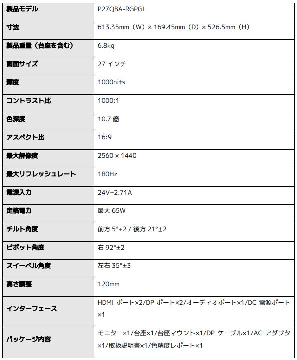 ■Xiaomi Mini LED ゲーミングモニター G Pro 27iのスペック概要