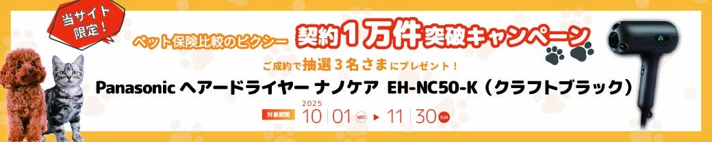 対象期間中に『ペット保険比較のピクシー』から対象のペット保険に申し込み、ご成約された方を対象に、抽選で3名さまにPanasonic ヘアードライヤー ナノケア nanocare ULTIMATE クラフトブラック EH-NC50-Kをプレゼントいたします。(※補償開始日時点で解約されていない方)