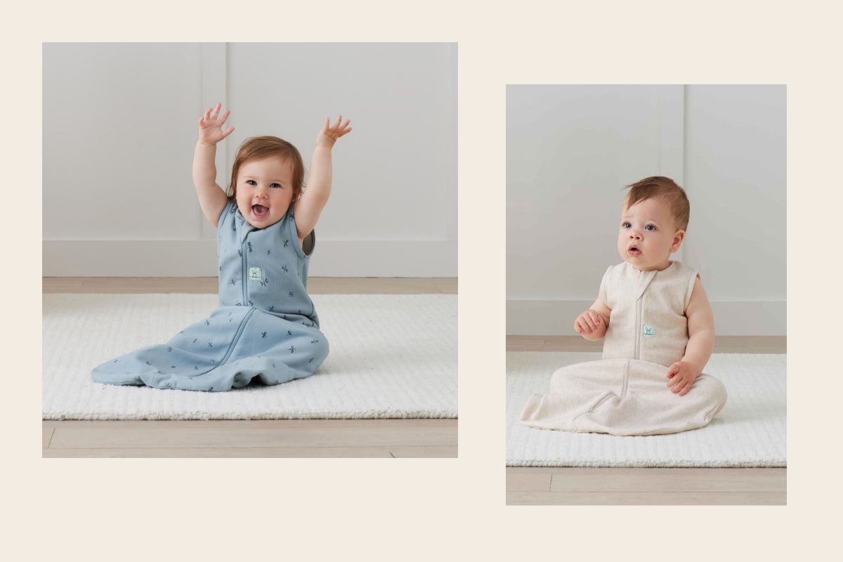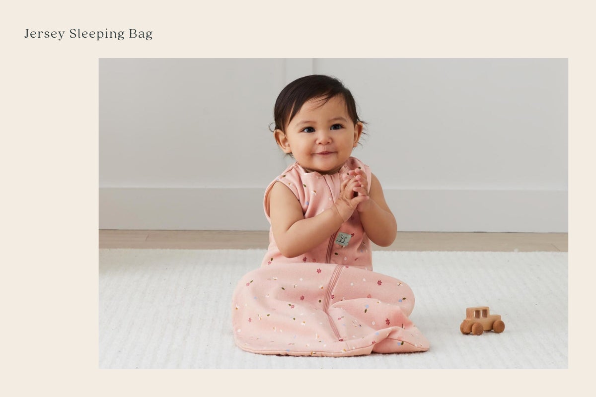 ジャージースリーピングバッグは、スワドルに似たフィット感を残しながら、寝返りをしはじめた赤ちゃんが足を自由に動かせるように、脚周りのスペースが広めに設計されています。