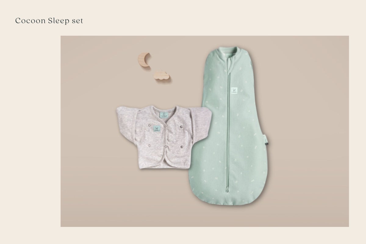 コクーンスリープセットは、新生児用スリープウェアの中でも人気のあるコクーンスワドルバッグとバタフライカーデのセットです。