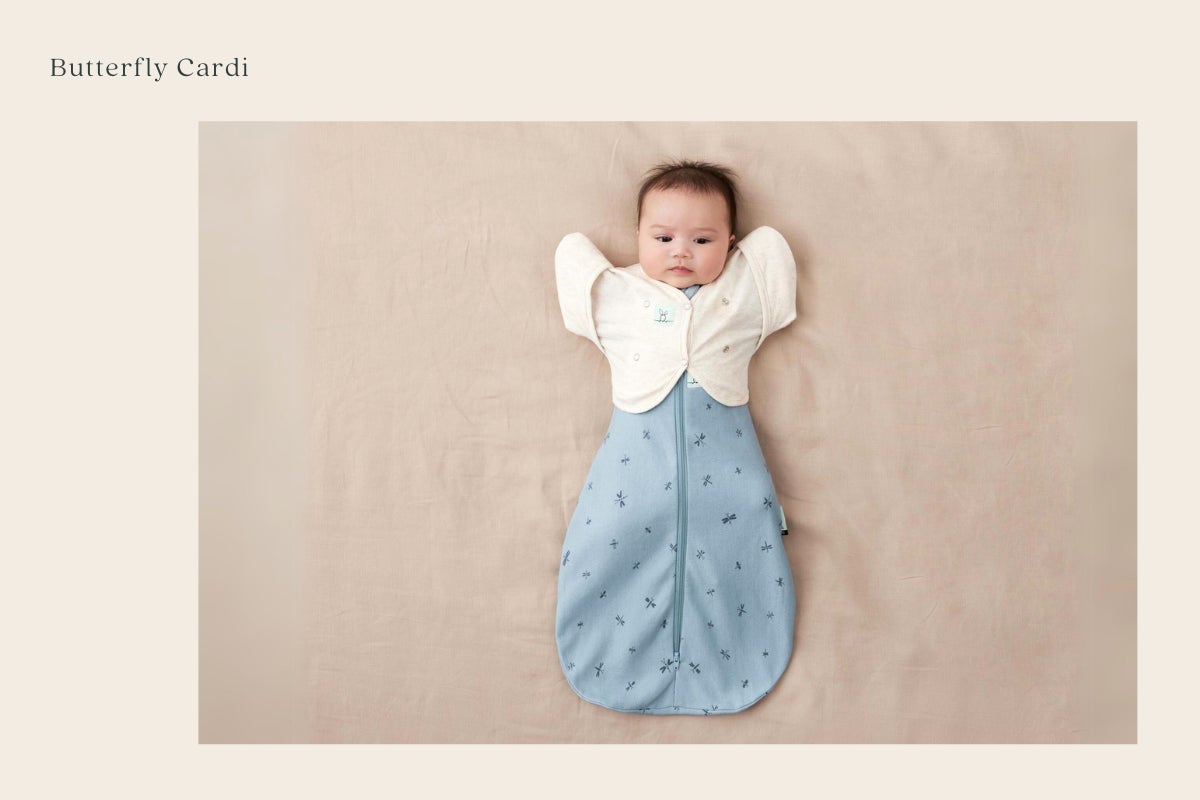 バタフライカーデは、赤ちゃんが安心して眠ることができるオプションアイテムです。スワドルやスリーピングバッグの上に着用することで快適な眠りをサポートします。