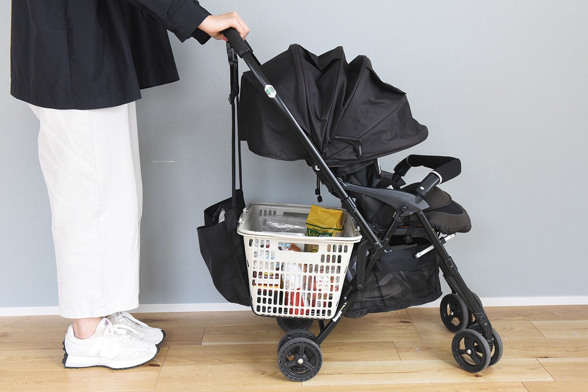 店内ではレジかごを載せてお買い物。お会計後には、詰め替えたエコバッグをのせて帰ればOK。ベビーカーでの毎日の買い出しも、ぐっとスムーズになりそうです。
