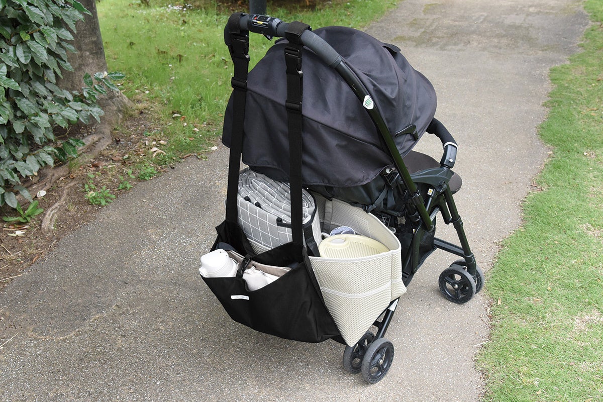 設置は簡単!ベビーカーに引っ掛けるだけでOK。ハンモックのように吊るすことで、荷物を置けるスペースが誕生します。ベビーカーの下部にできる空間を利用した設計だから、低重心に荷物を載せられるので、ベビーカーが倒れにくく安心です。