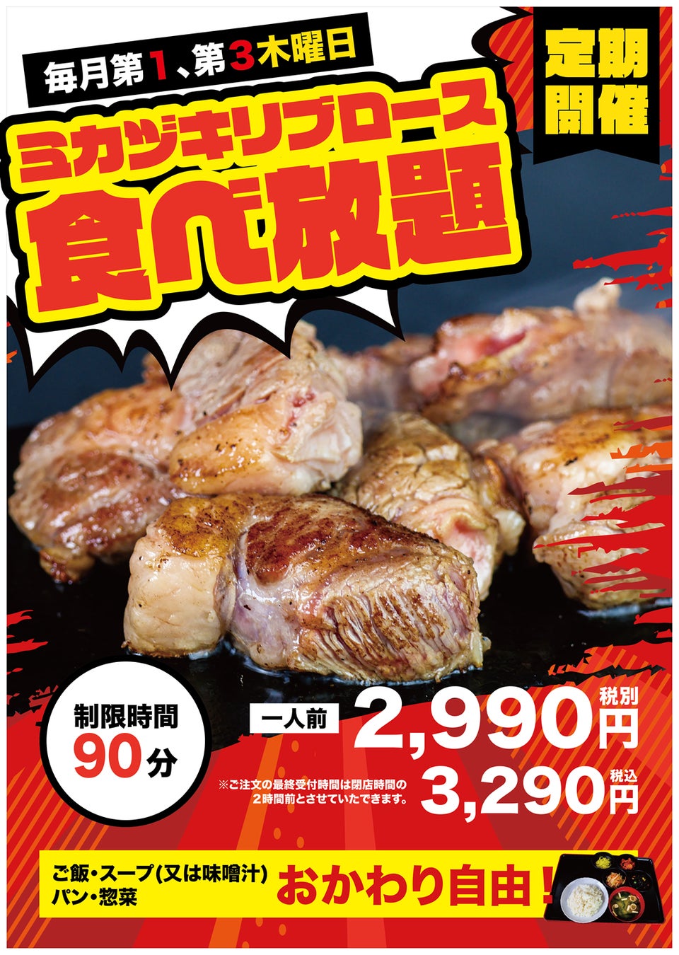 10月3日(木)人気No.1「ミカヅキリブロース食べ放題」4皿食べれば、1000円お得、5皿食べれば2000円お得!食べれば食べる程お得な赤字覚悟の企画を定例開催!(第一、第三木曜日開催)