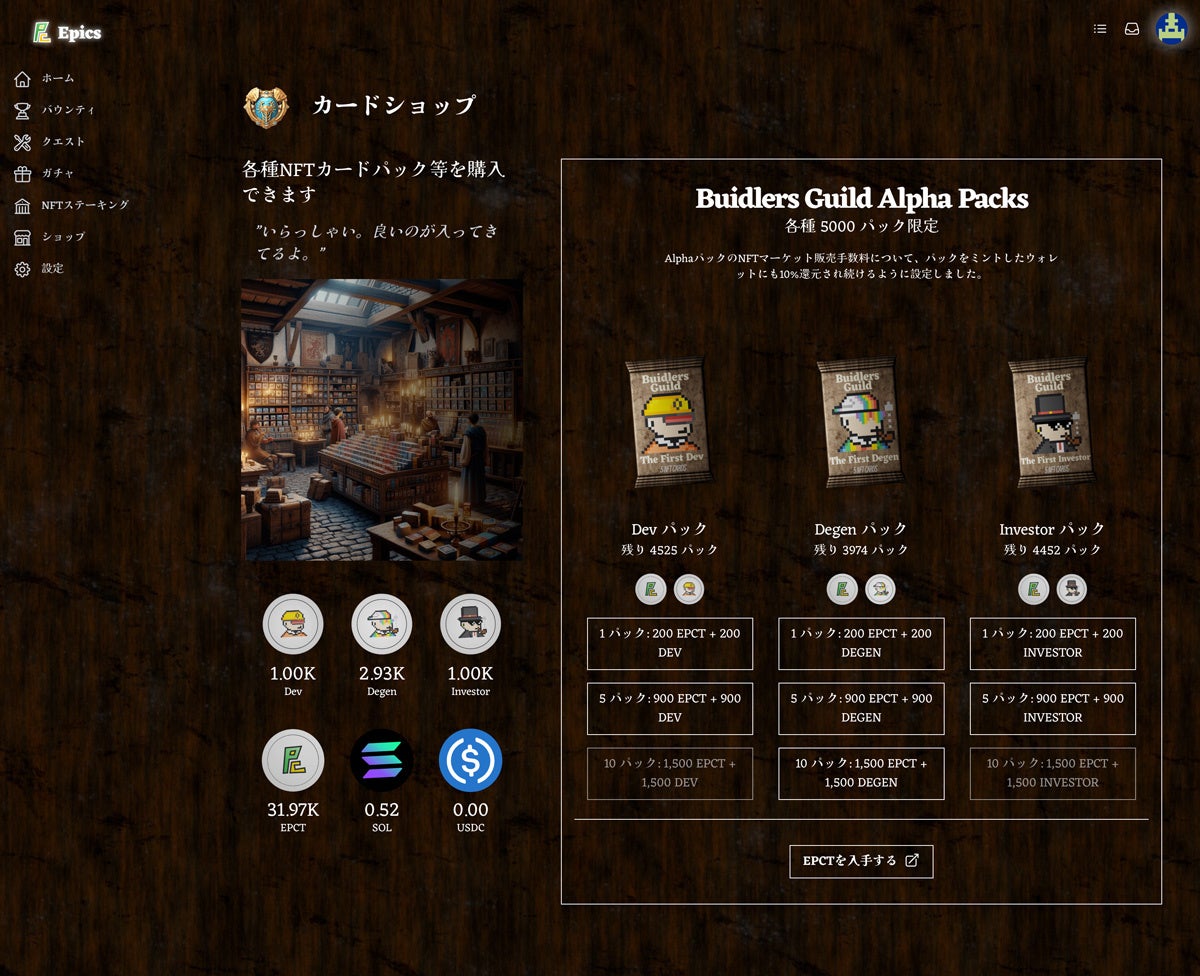 1 月 29 日、Epics DAO は、プラットフォーム上にて NFT カードショップをオープン、NFT カードゲーム「Buidlers Guild」のアルファパックについて販売(ミント)を開始しました。
