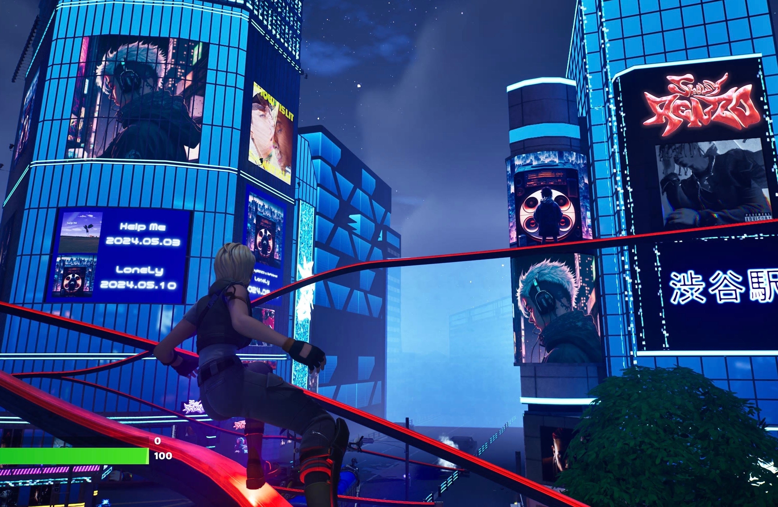 「Showy City」の舞台は、東京・渋谷!109やQ FRONTなど象徴的なビルをはじめ、渋谷の中心部をサイバーパンクな世界観で再現。ビル壁面や街頭ビジョンを、ShowyRENZO x leftlenzのビジュアルに覆われた渋谷の街を楽しめます。ゲームシステムはバトルロイヤル。仲間や友人を誘って、ぜひご参加ください。