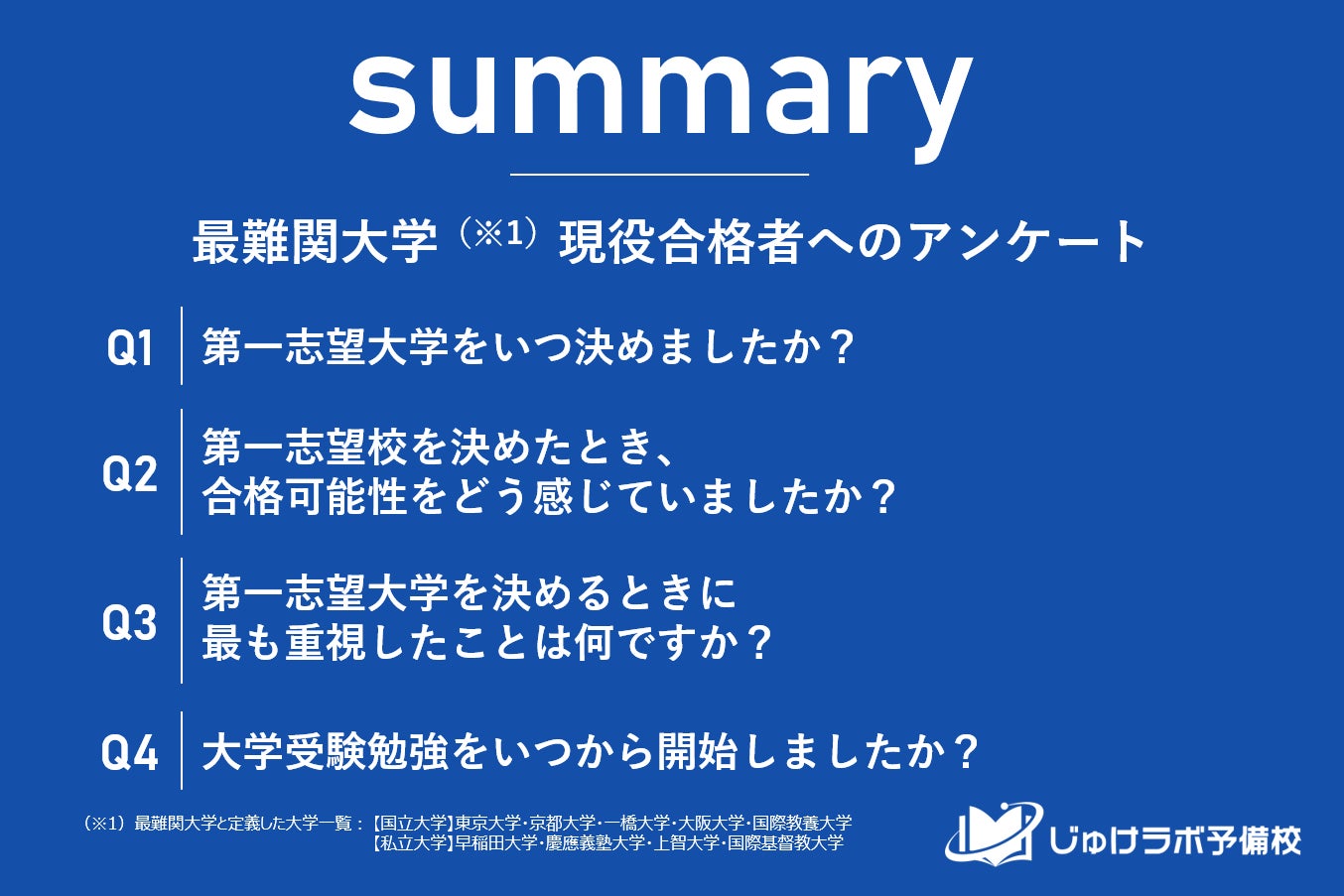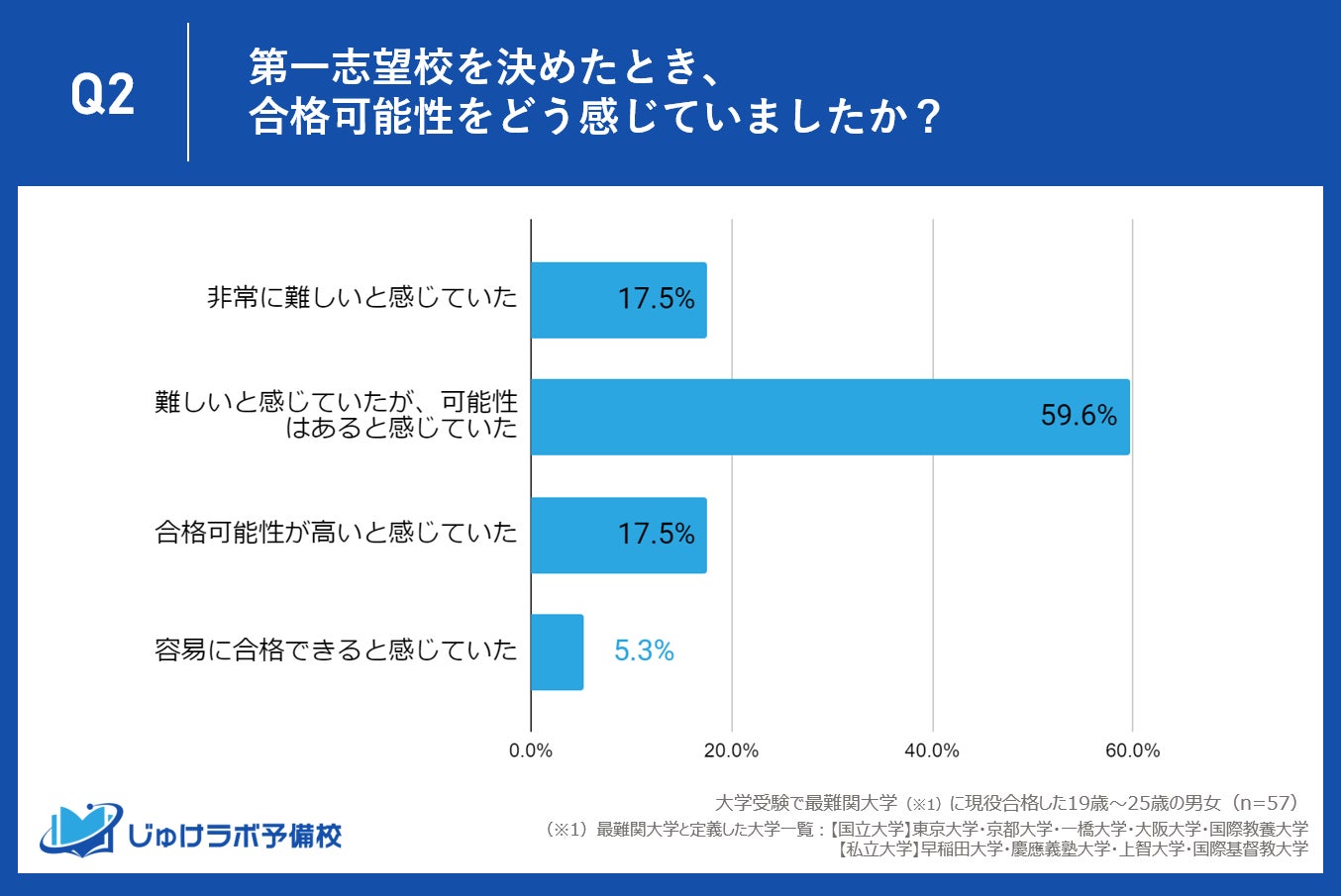 じゅけラボ予備校(所在地:大阪市北区、代表取締役:後藤智則)は、第一志望の最難関大学(※1)に現役合格した57名を対象に、志望校を決定した時期や受験勉強の開始時期に関する調査を実施しました。