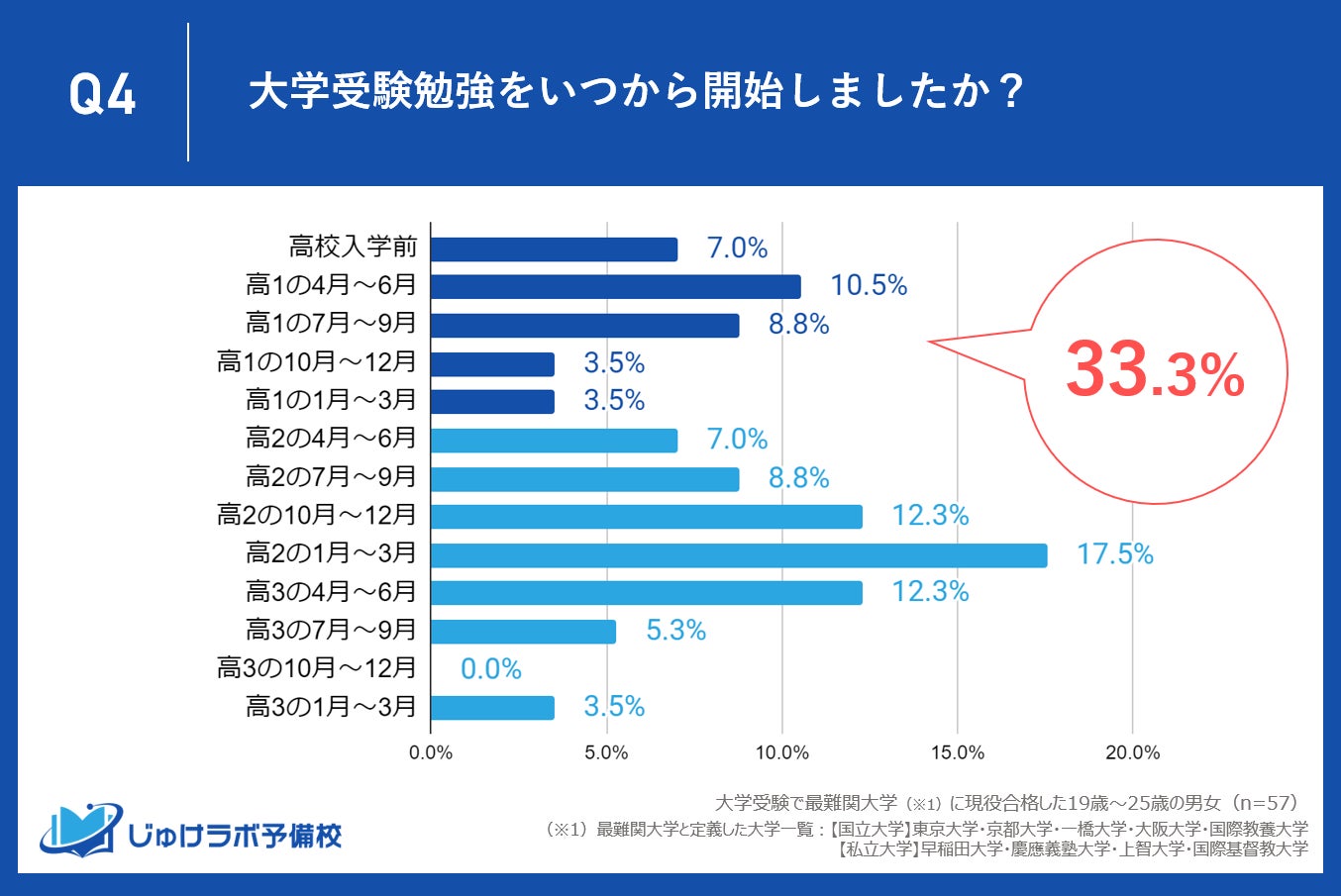 驚くべきことに、最難関大学に現役合格した人のうち、高校入学前に既に受験勉強を開始していた人が全体の7.0%、高校1年生の4月から6月に勉強をスタートした人が10.5%、高1の春までに受験勉強を開始した人が合計で17.5%となっており、高校1年生までに受験勉強をスタートした割合を合計すると全体の33.3%に上ることが明らかになりました。
