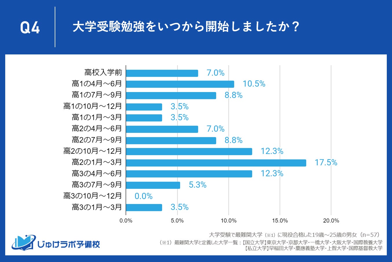 次に高校2年の10月から12月、そして高校3年の4月から6月にかけて受験勉強を開始した人がそれぞれ12.3%を占めており、この時期に集中して勉強をスタートする学生が次に多いことが明らかになりました。