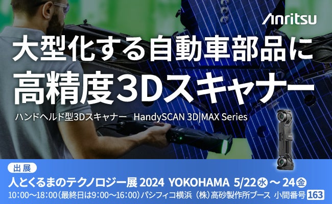 アンリツ株式会社(社長 濱田 宏一)は、CREAFORM社のハンドヘルド型3Dスキャナー『HandySCAN 3D|MAX Series』を、2024年5月22日から5月24日までパシフィコ横浜にて開催される『人とくるまのテクノロジー展 2024 YOKOHAMA』の株式会社高砂製作所のブースで、実演を交えて出展します。