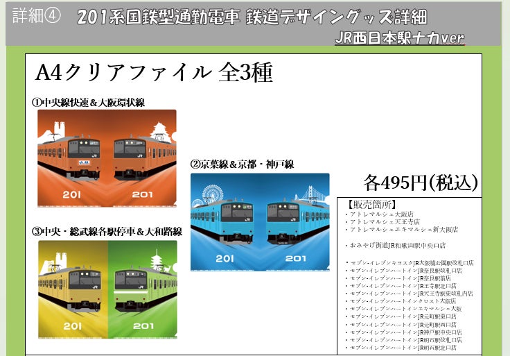 「A4 クリアファイル(全3 種)」はJR ⻄日本駅ナカ8店舗で、「大和路線201 系駅名標キーホルダー」はJR ⻄日本エリアの駅ナカ店舗・通販サイトにて数量限定商品として発売します。