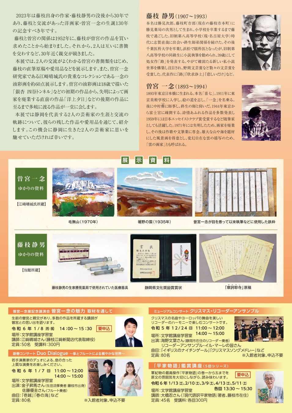 藤枝出身の小説家・藤枝静男、彼と親交があった洋画家・曽宮一念、2人を取り上げた展示会を開催しています。曽宮の油彩画約60点をはじめ、藤枝の自筆原稿や愛用品、二人の書簡など約120点を展示しています。