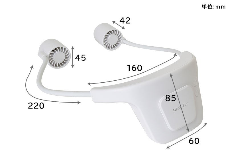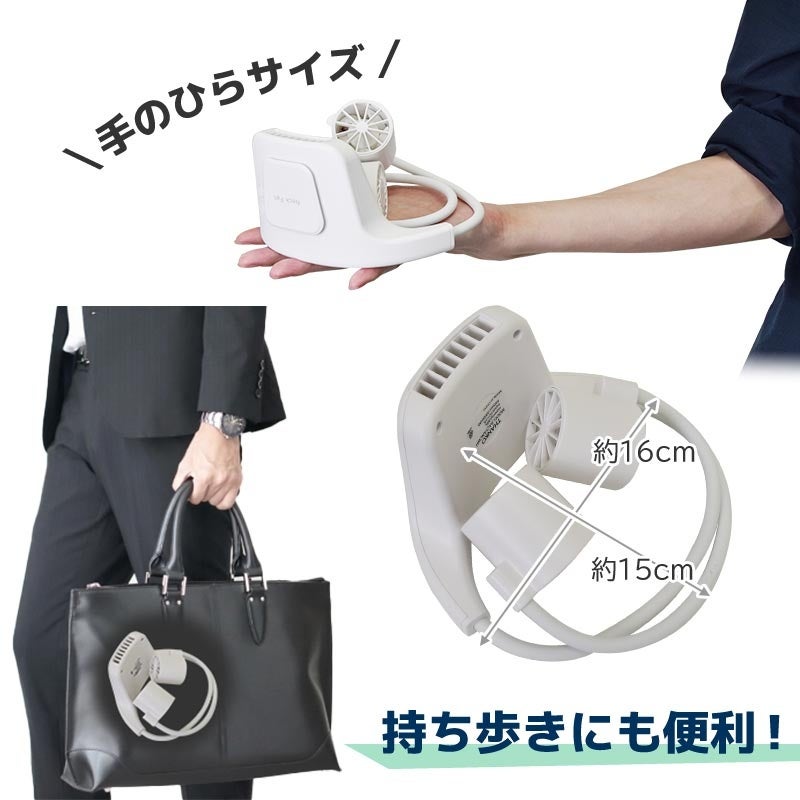 本製品は自由に動く前2個のファンと背中に風が送れるファンを搭載した首掛け式のウェアラブルファンです。